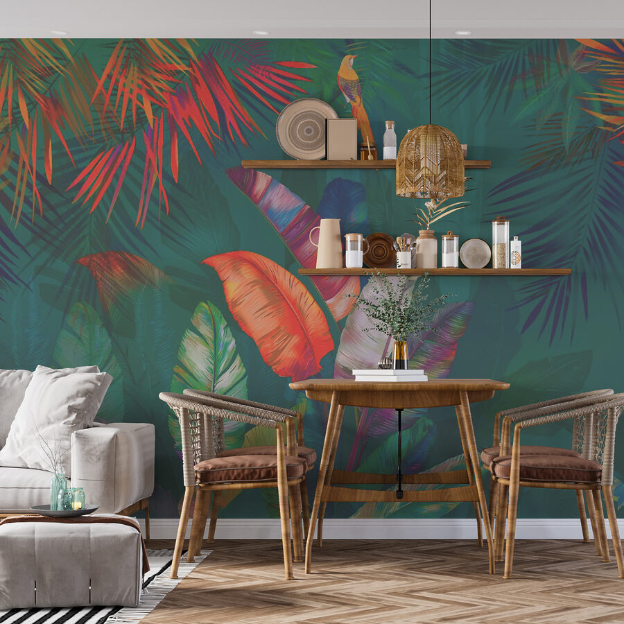 Predstavte si, že vojdete do svojej izby a okamžite sa prenesiete do bujnej tropickej džungle. Fototapeta “Farebná scéna tropickej džungle s lístím” presne to dokáže – je to ako váš osobný raj na stene! Prekypuje živými farbami a výraznými vzormi listov, má tú sviežu, outdoorovú atmosféru, vďaka ktorej sa aj pondelky budú cítiť trochu viac ako mini dovolenka.