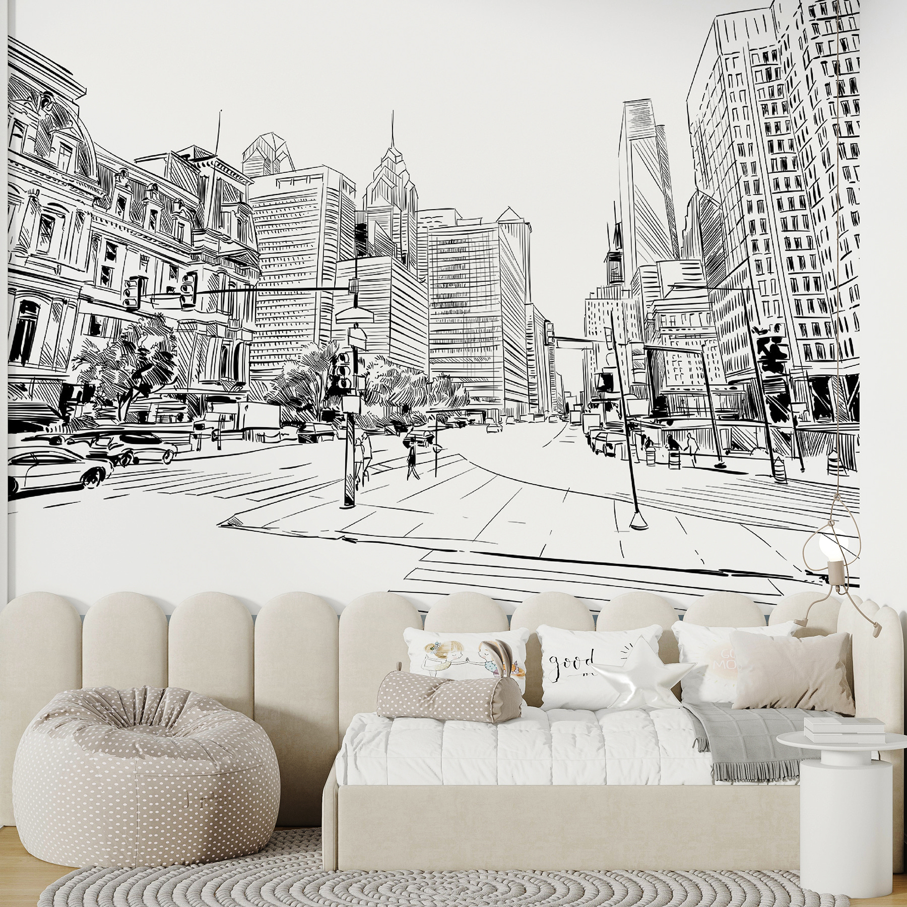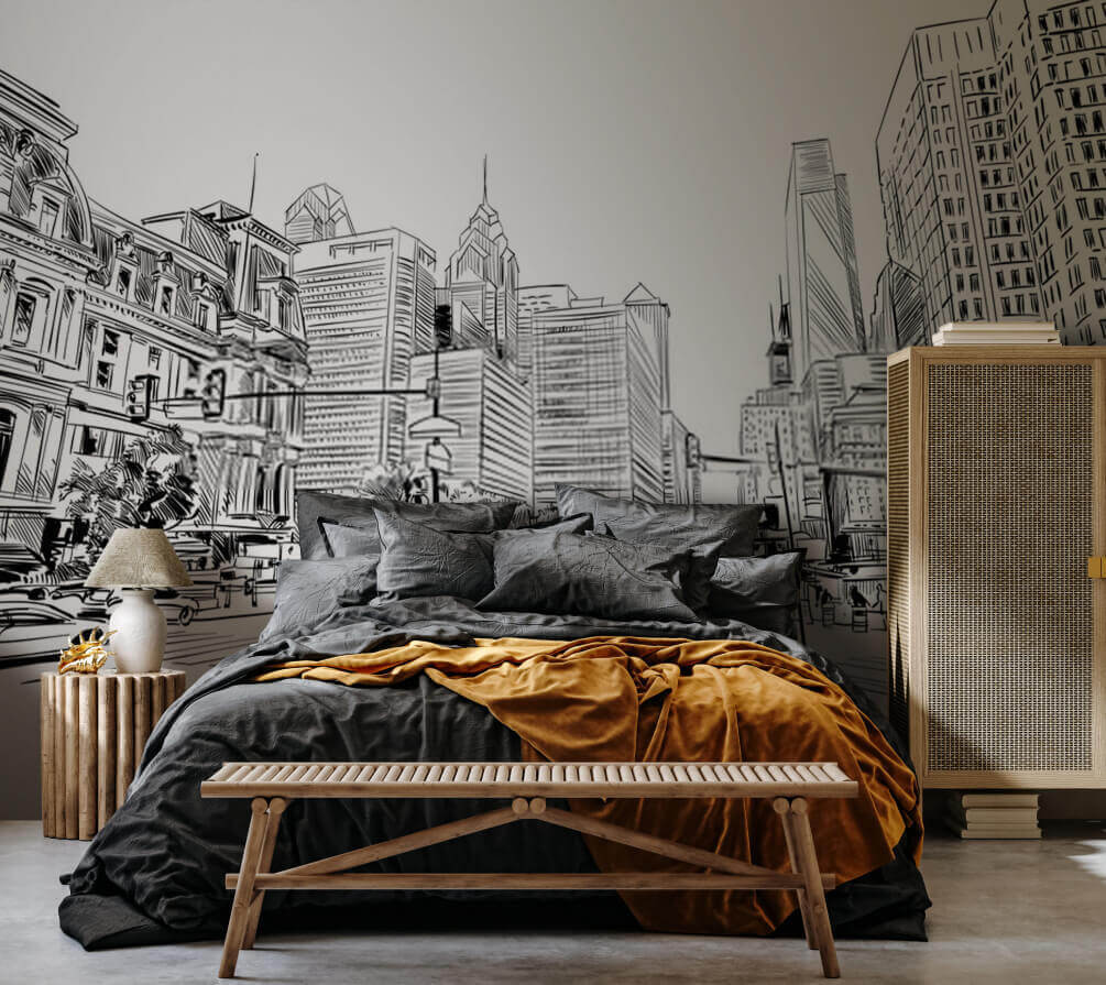 Ahoj! Pozrite si túto skvelú nástennú maľbu – je to čiernobiely náčrt mestskej krajiny, ktorý vyzerá ako z grafického románu. Viete si predstaviť, že by ste sa na to zobudili? Je to ako mať rušné mesto priamo vo svojej obývačke, bez hluku a davov. Ideálne na to, aby ste svojmu priestoru dodali trochu mestskej elegancie, však?