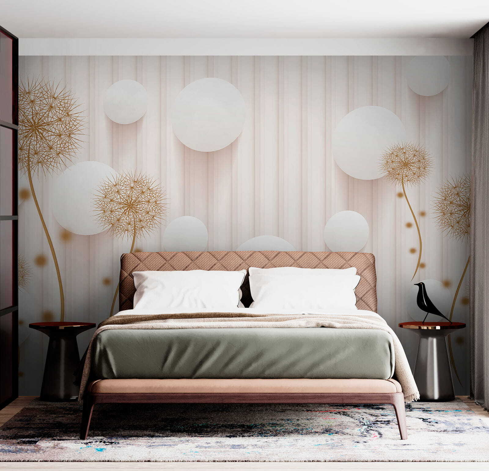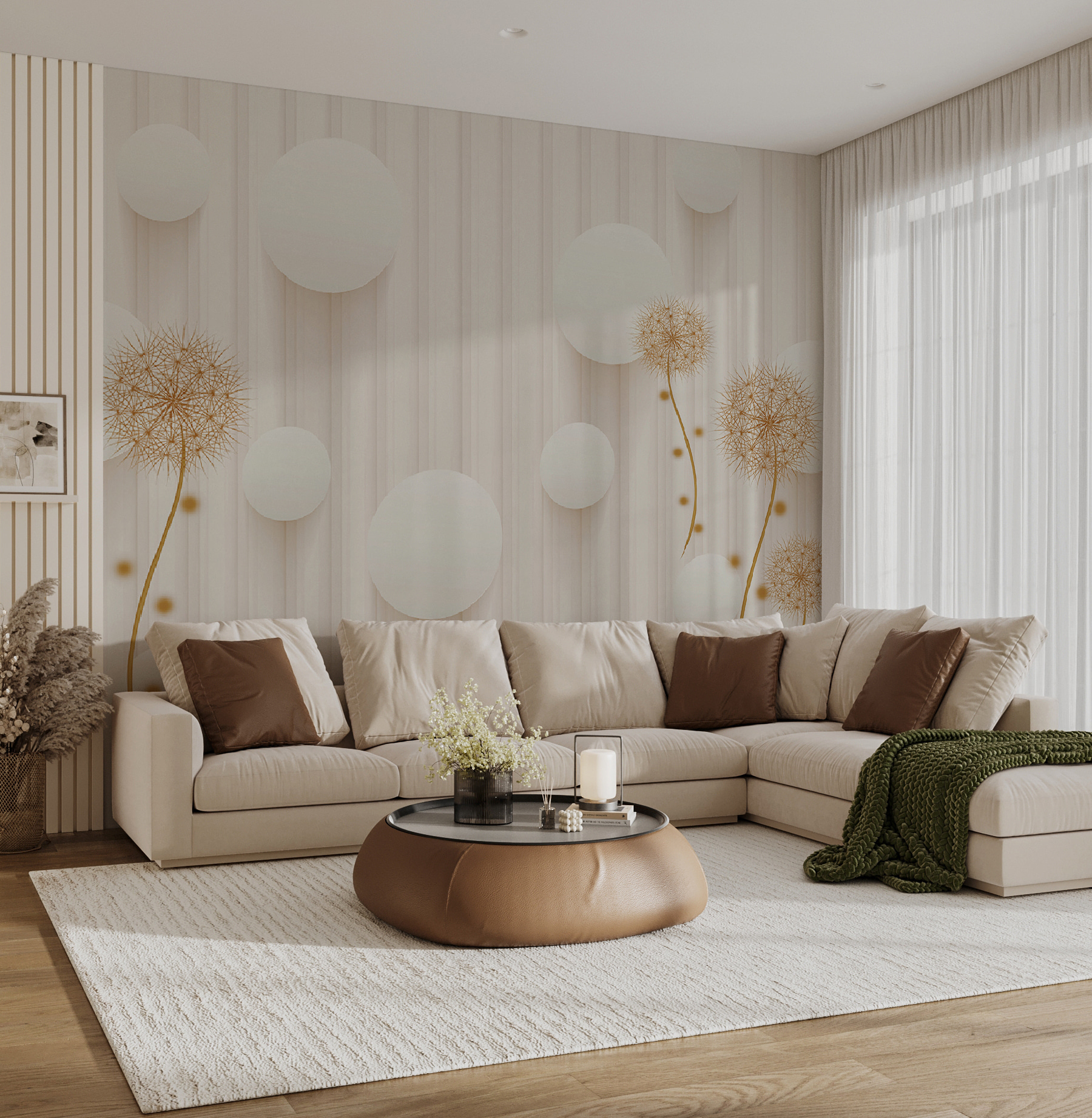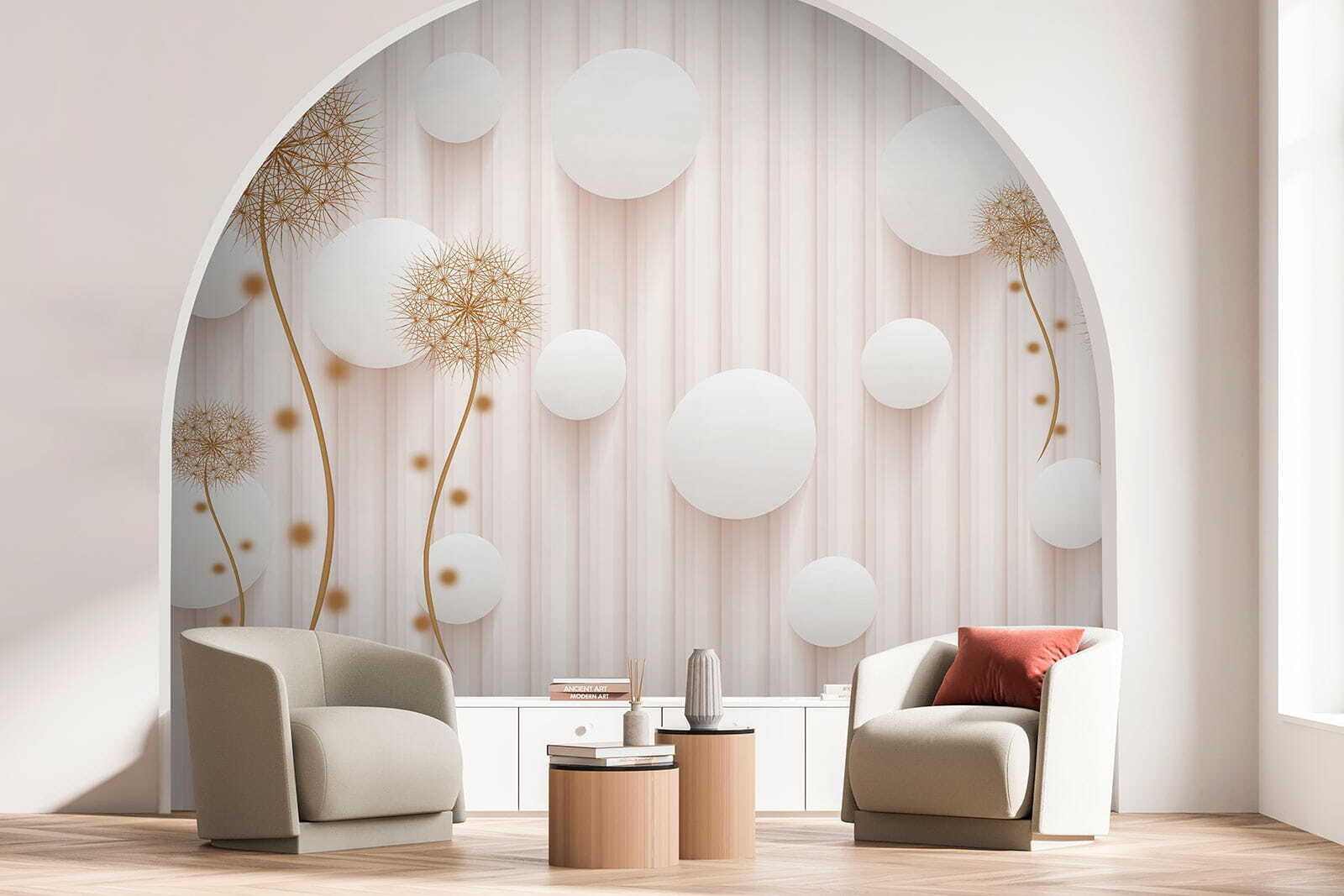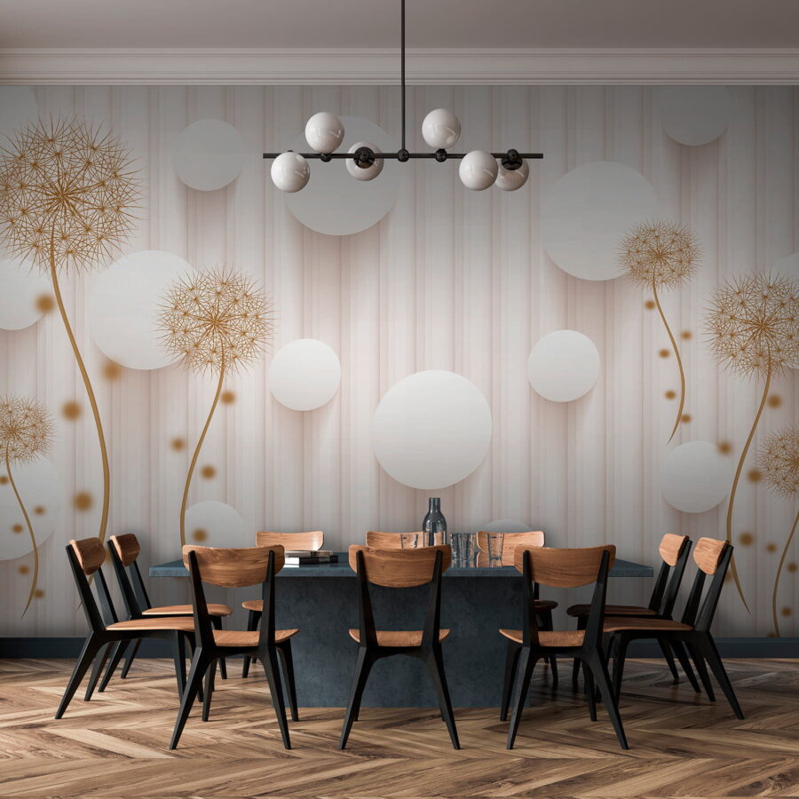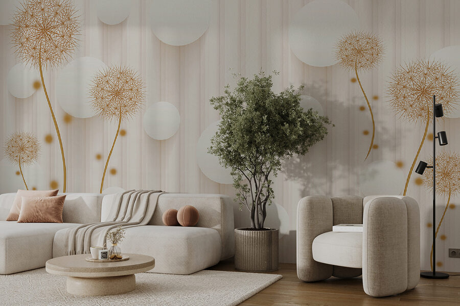 Premeňte akýkoľvek priestor pomocou rozmarného kúzla nástennej maľby “Biele kruhy a púpavy”. Predstavte si, že vojdete do miestnosti, kde púpavy hravo tancujú vedľa vzdušných bielych kruhov a vytvárajú ľahkú, zasnenú atmosféru. Akoby vám steny našepkávali tajomstvá slnečných lúčov a jemného vánku. Táto nástenná maľba, ktorá je ideálna pre útulný čitateľský kútik alebo svetlý vchod, dodáva prírode nádych kúzla bez peľových alergií! Hostia sa budú usmievať, deti budú žasnúť a vy sa možno dokonca pristihnete pri tom, ako sa zasnívate. Kto by povedal, že nástenná maľba môže vyvolať takú radosť? Len si to predstavte – jasné rána s pozadím, ktoré pripomína svieži jarný deň, a to po celý rok. Dokonalé, však?