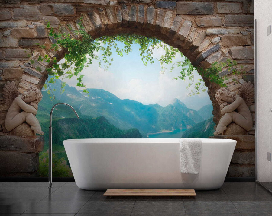Predstavte si, že prejdete rustikálnym kamenným oblúkom, ktorý vedie priamo do úchvatného výhľadu na údolie. Táto nástenná maľba nie je len dekoráciou, ale každý deň v nás vyvoláva malé dobrodružstvo. Predstavte si, ako popíjate rannú kávu a pritom sa pozeráte na sviežu zeleň a trblietajúcu sa vodu pod vami. Hravé anjeliky na oboch stranách dodávajú nádych rozmarnosti, takže sa cítite ako v scéne z rozprávky. Táto nástenná maľba je ideálna do obývačky alebo útulného zákutia a premení každý priestor na zasnený únik. Je to ako mať kúsok prírody priamo na stene, ktorý bez námahy vnesie do každodenného života pocit pokoja a zázraku. Len nezabudnite zalievať tie imaginárne rastliny!