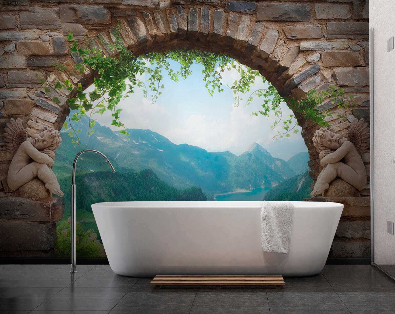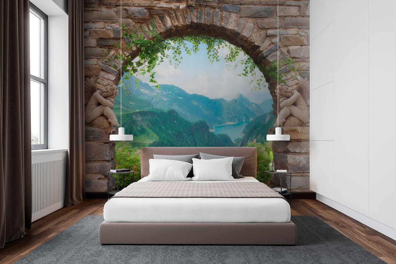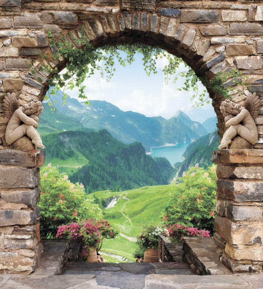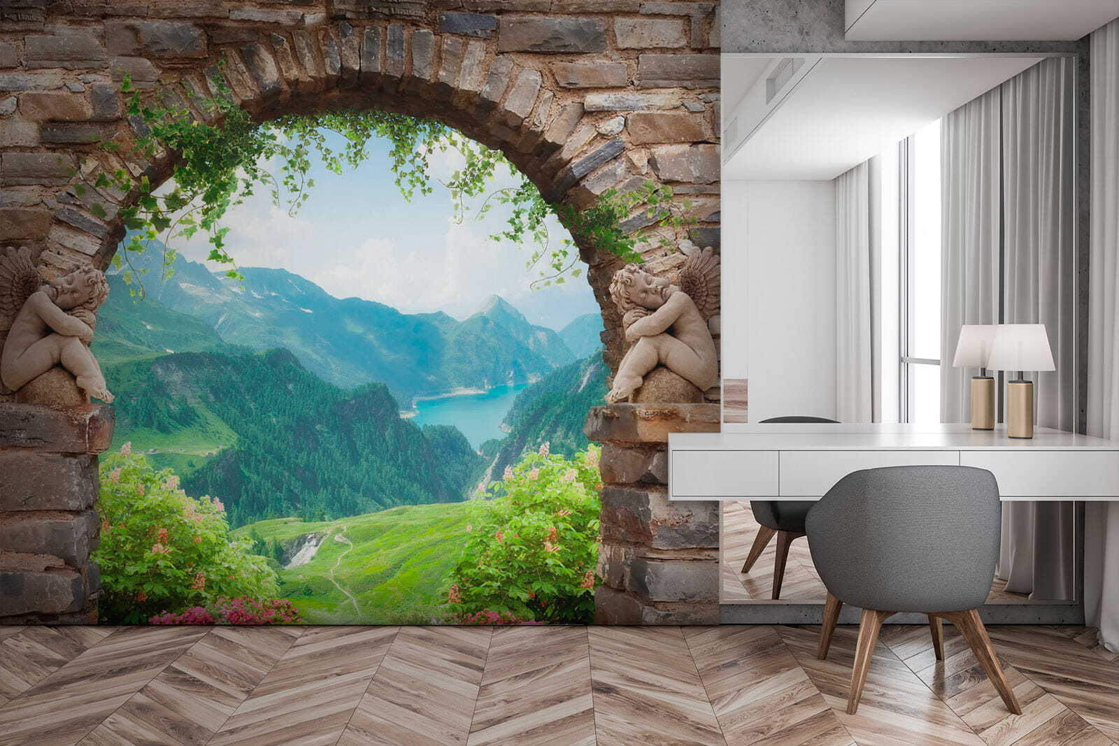 Predstavte si, že prejdete rustikálnym kamenným oblúkom, ktorý vedie priamo do úchvatného výhľadu na údolie. Táto nástenná maľba nie je len dekoráciou, ale každý deň v nás vyvoláva malé dobrodružstvo. Predstavte si, ako popíjate rannú kávu a pritom sa pozeráte na sviežu zeleň a trblietajúcu sa vodu pod vami. Hravé anjeliky na oboch stranách dodávajú nádych rozmarnosti, takže sa cítite ako v scéne z rozprávky. Táto nástenná maľba je ideálna do obývačky alebo útulného zákutia a premení každý priestor na zasnený únik. Je to ako mať kúsok prírody priamo na stene, ktorý bez námahy vnesie do každodenného života pocit pokoja a zázraku. Len nezabudnite zalievať tie imaginárne rastliny!