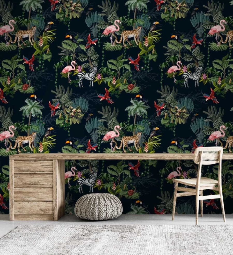 Premeňte akúkoľvek stenu na živú únikovú zónu s touto ohromujúcou nástennou maľbou s plameniakmi a zebrami uprostred bujnej tropickej vegetácie. Je to ako priniesť kúsok divočiny priamo do vašej obývačky – alebo do kúpeľne, ak sa cítite odvážni! Predstavte si, že vstúpite do bujnej džungle zakaždým, keď prejdete okolo. Sýte farby vynikajú na tmavšom pozadí, čo z neho robí perfektnú kulisu pre útulné posedenia alebo relaxáciu v samote. Navyše je to skvelý spúšťač konverzácie – kto by nemal rád rozhovory o exotických zvieratách? Táto nástenná maľba nie je len dekoráciou, je to zážitok. Vylepšite tú fádnu stenu a nechajte džungľu ožiť!