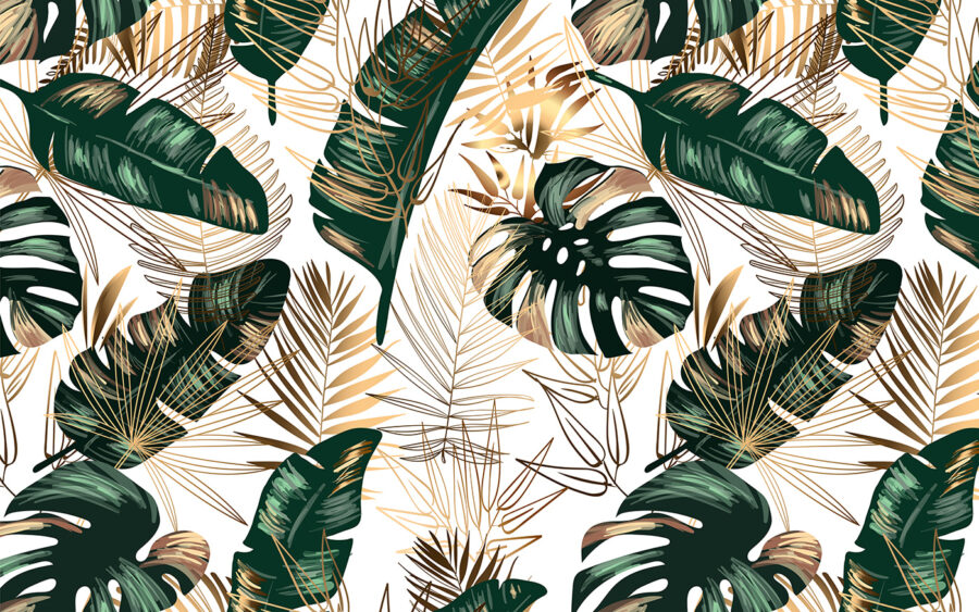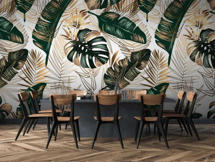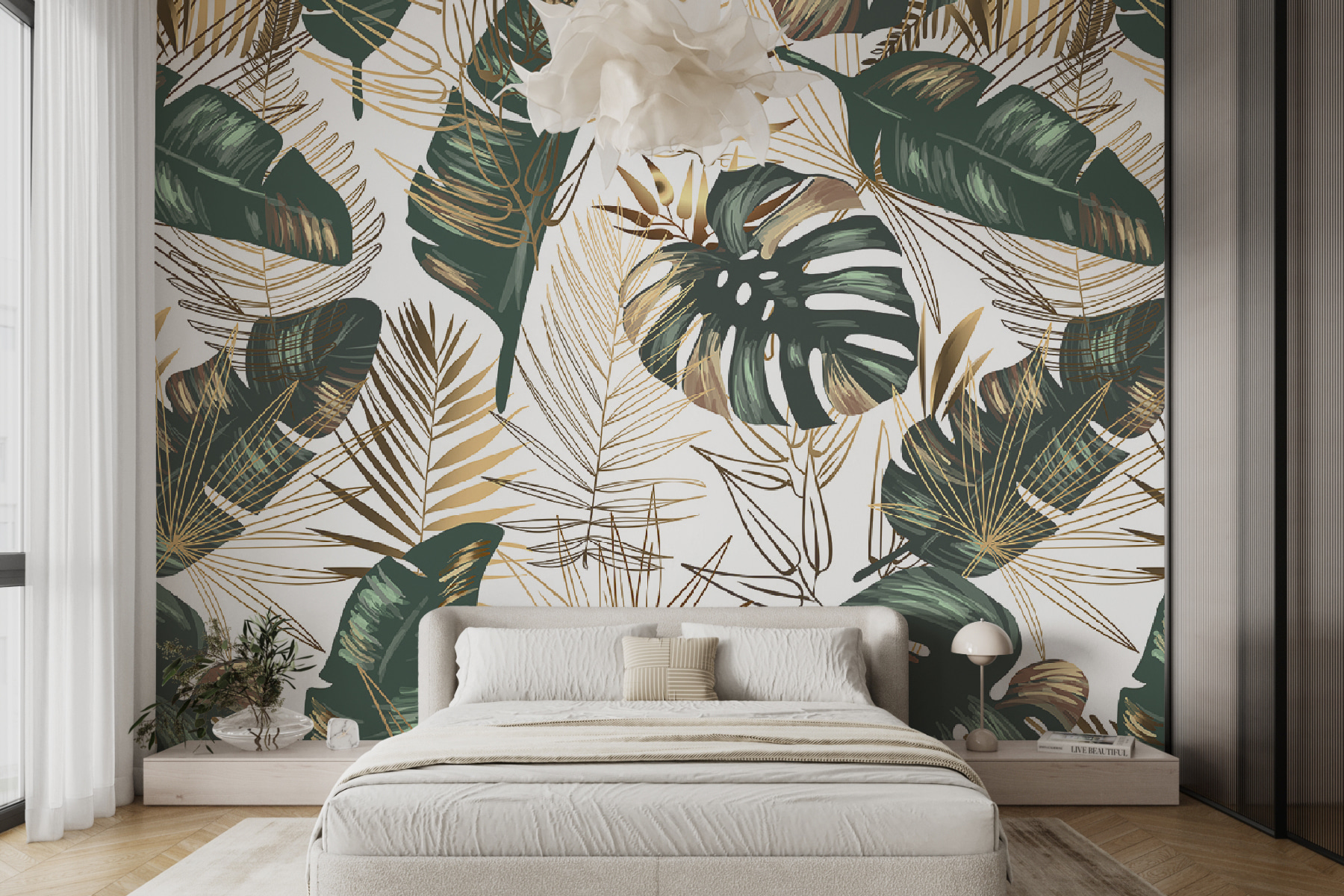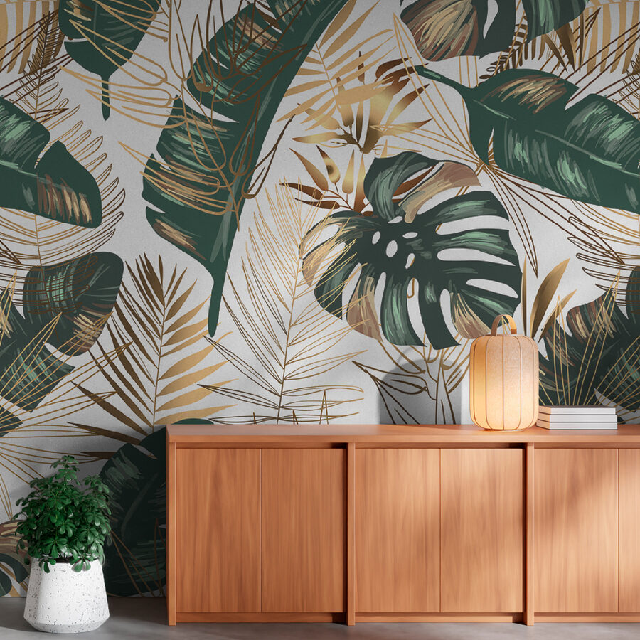 Premeňte akúkoľvek miestnosť na tropický raj s týmito žiarivými nástennými maľbami so sviežimi listami a hravými abstraktnými vzormi. Predstavte si, že vstúpite do svojej obývačky a budete mať pocit, že ste práve pristáli na bezstarostnom ostrove – tieto zelené a zlaté farby priam nabádajú k relaxácii. Či už ide o útulný kútik na čítanie, alebo o živý priestor na stretnutie s priateľmi, táto nástenná maľba dodáva dokonalý nádych osobitosti. Je ako jemná pripomienka, aby ste spomalili a nasávali krásu okolo seba. Kto by nechcel popíjať drink a predstierať, že je na dovolenke priamo u seba doma?