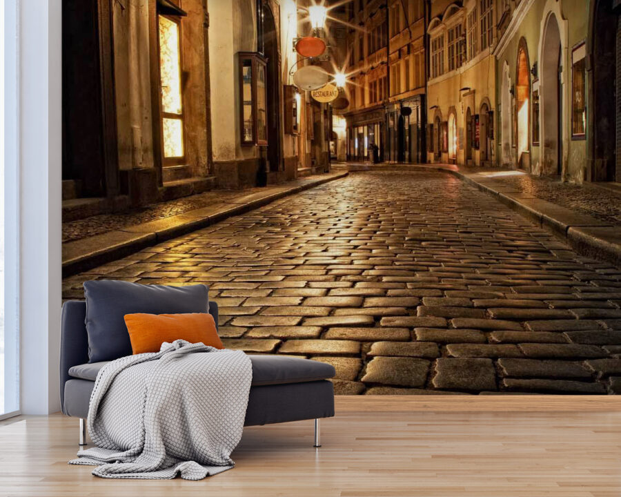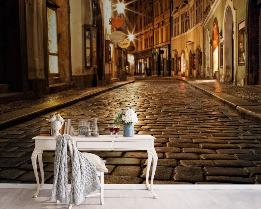 Premeňte akúkoľvek miestnosť na útulný kútik očarujúceho mesta s touto fototapetou „Kamenná ulica s budovami a pouličnými lampami“. Predstavte si, že vstúpite do scény, kde sa dlažobné kamene lesknú v jemnom svite pouličných lámp. Je to ako pozvať kúsok rozprávkovej nočnej prechádzky priamo do vášho domova. Teplé odtiene vyvolávajú pocit nostalgie, vďaka čomu je táto fototapeta ideálna do jedálenského kúta alebo relaxačnej čitateľskej zóny. Predstavte si, ako sa zviniete s knihou v náručí a popíjate svoj obľúbený čaj, obklopení príjemným pocitom večerného prechádzania sa. Ideálne pre tých, ktorí túžia po troche mestskej mágie!