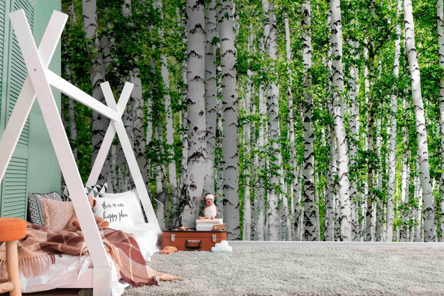 Premeňte akúkoľvek miestnosť na pokojnú oázu s touto ohromujúcou nástennou maľbou, na ktorej je zobrazený háj stromov s jasne zelenými listami. Predstavte si, že vstúpite do svojej miestnosti a máte pocit, ako keby ste vstúpili do pokojného lesa, kde jemne šumia listy vo vetre. Je to, ako keby sa príroda rozhodla stráviť trvalú dovolenku vo vašej domácnosti. Táto nástenná maľba je ideálna do útulných obývačiek alebo pokojných spální a pozýva vás k relaxácii a odpočinku. Navyše je skvelým spúšťačom konverzácie – kto by sa nechcel porozprávať o svojom vnútornom lese? Či už popíjate kávu alebo sa zviniete s knihou, táto tapeta dodáva osviežujúci nádych, ktorý zahreje dušu a upokojí zmysly.