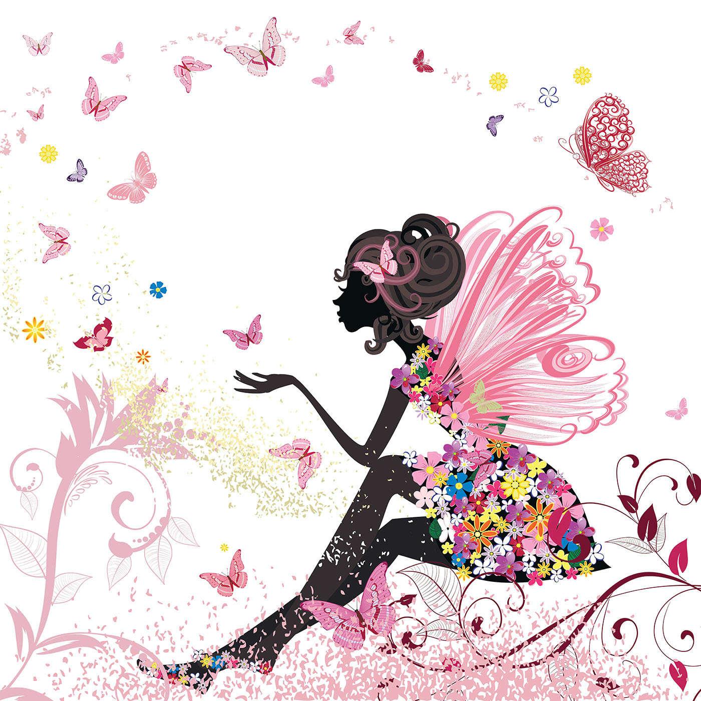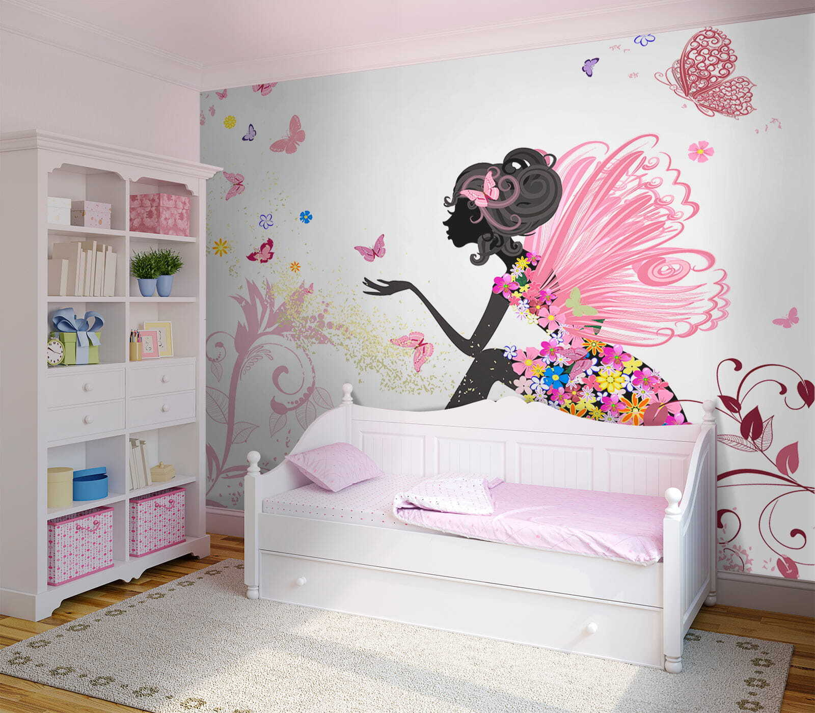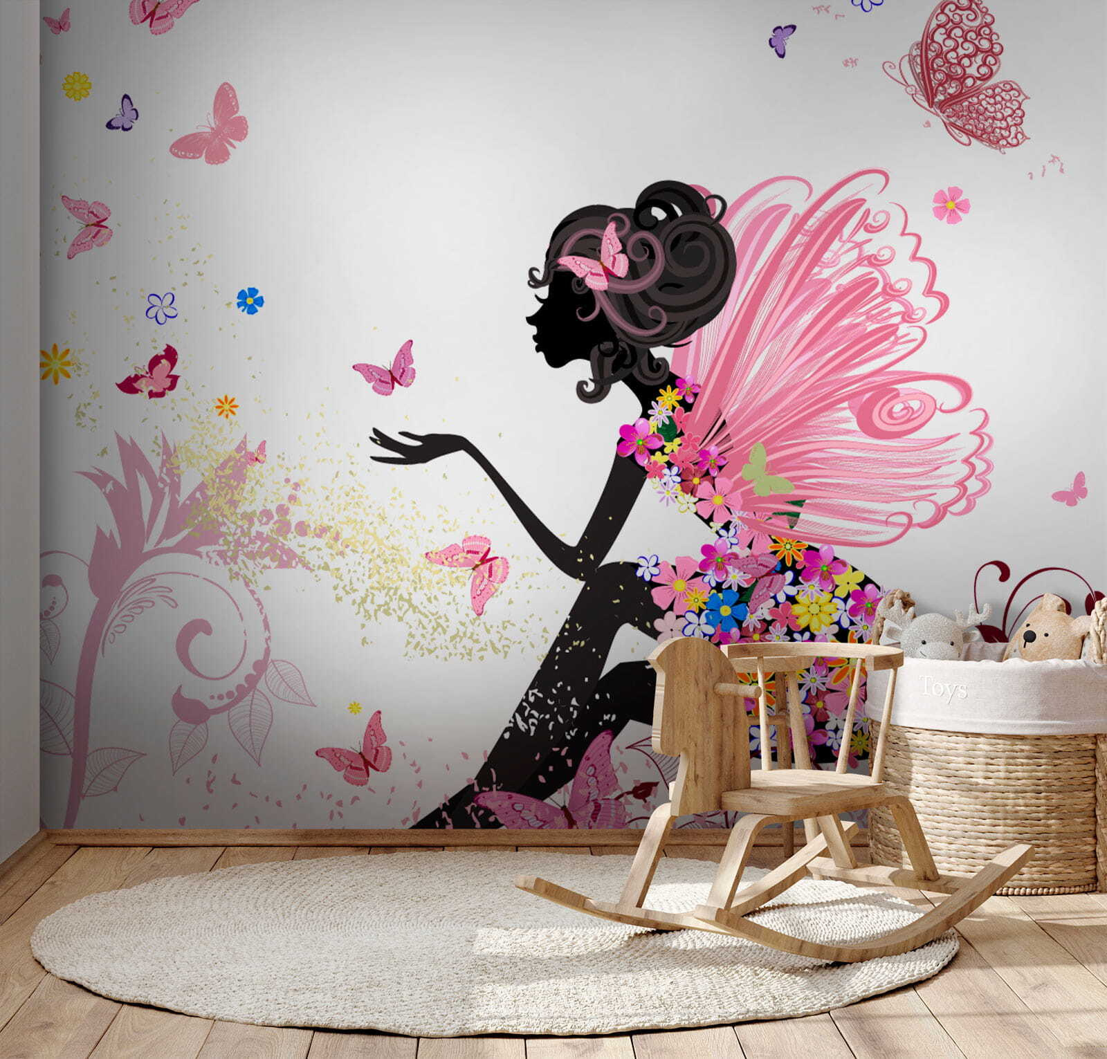 Táto očarujúca nástenná maľba “Profil ženy s motýľom vo vlasoch” je dokonalým doplnkom do izby vášho dieťatka. Predstavte si úžasnú siluetu ženy, ktorá je pôvabne obklopená poletujúcimi motýľmi, akoby bola v tajnej záhrade. Jemné ružové farby a rozmarné kvety dodávajú kúzlo – Je to ako mať rozprávku priamo na stene!