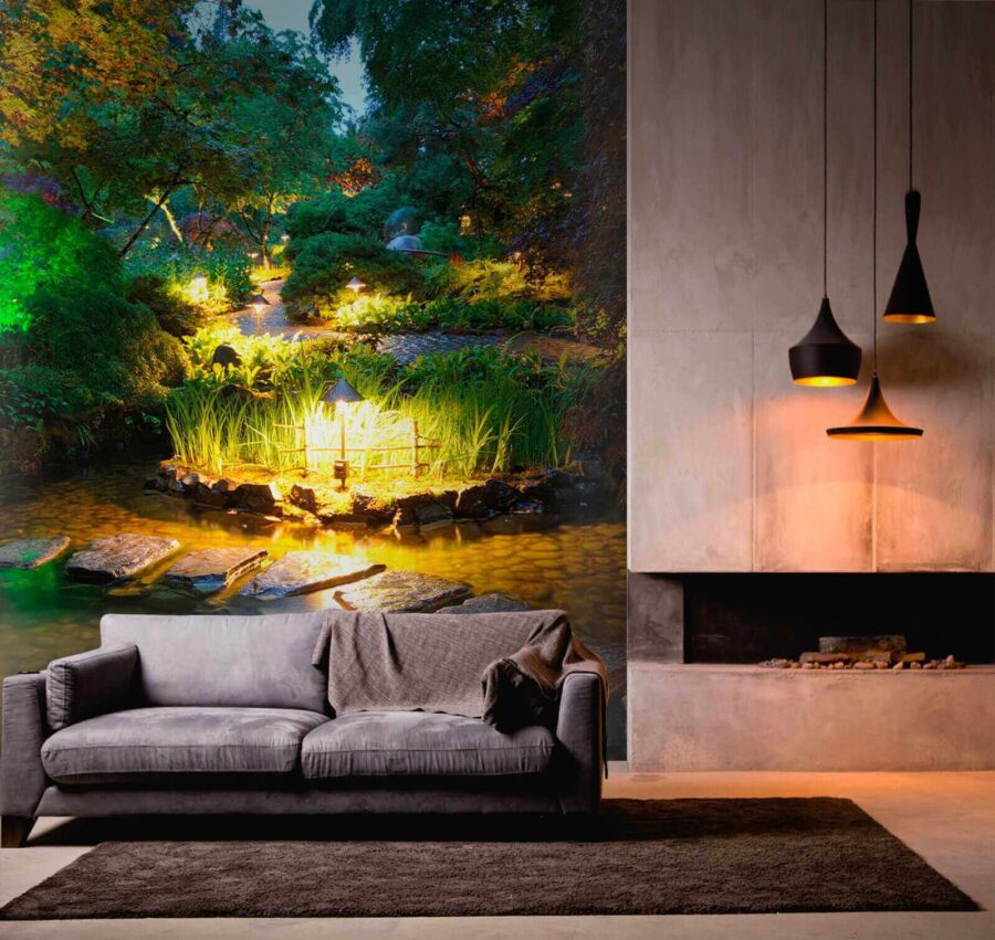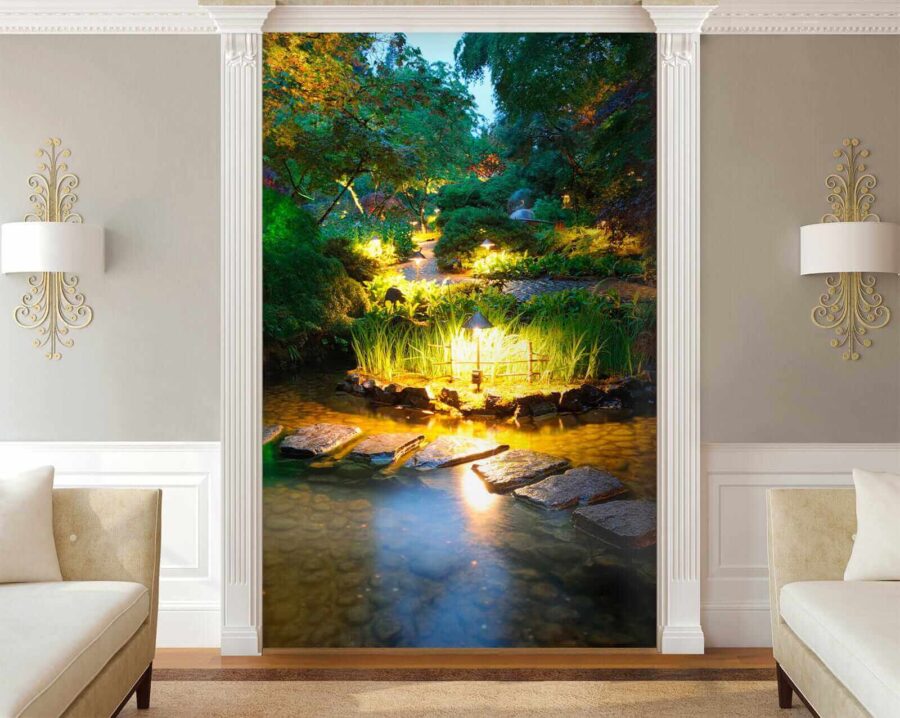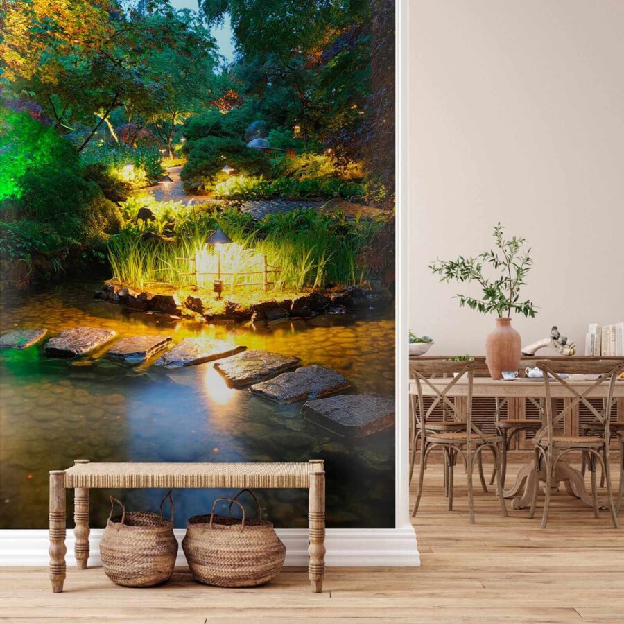 Premeňte akýkoľvek priestor s očarujúcou „nástennou maľbou Kamenná cestička v rybníku so svetlami“. Predstavte si, že vstúpite do pokojného útočiska priamo zo svojej obývačky! Táto nástenná maľba vás obklopí upokojujúcimi odtieňmi a jemne sa lesknúcimi svetlami, vďaka čomu budete mať pocit, ako keby ste sa prechádzali po skrytej záhrade za súmraku.