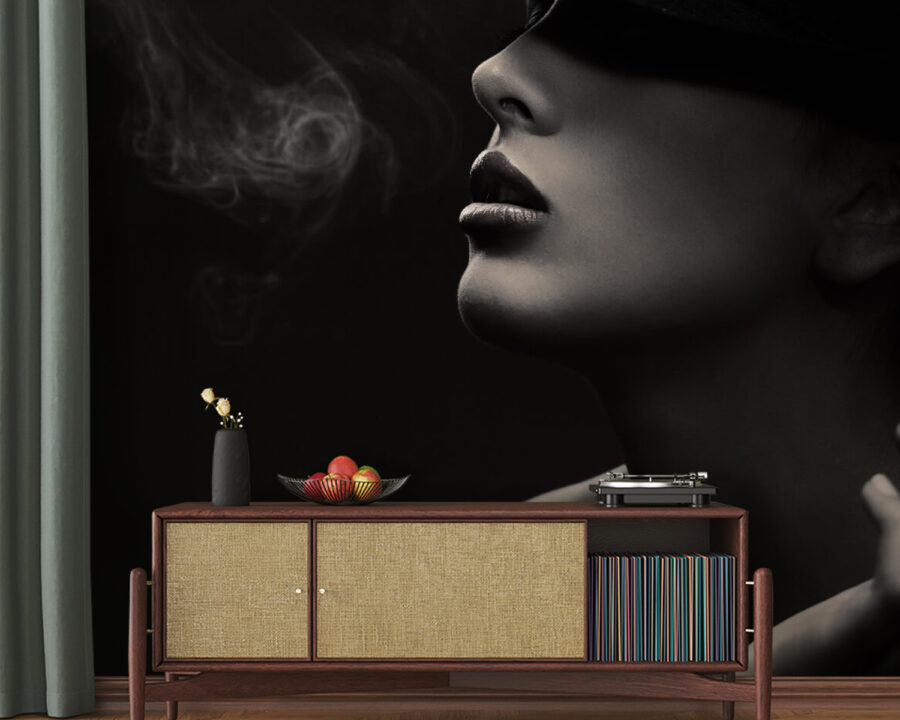 Premeňte svoj priestor na umelecké útočisko s touto podmanivou nástennou maľbou ženy v klobúku, ktorá ležérne fajčí. Je to ako vstúpiť do štýlovej kaviarne, kde každý kút šepká eleganciu a intrigy. Spôsob, akým hľadí do diaľky, obklopená vírom dymu, dodáva nádych tajomna – ideálny na vyvolanie zaujímavých rozhovorov.