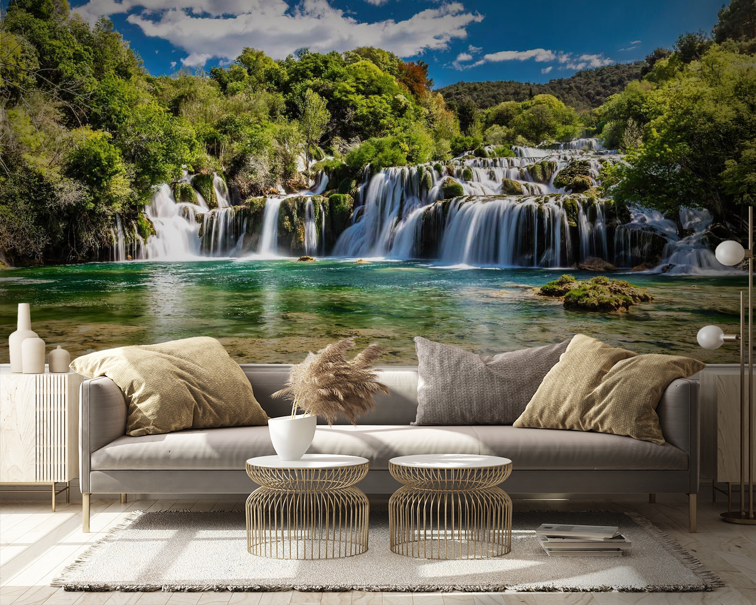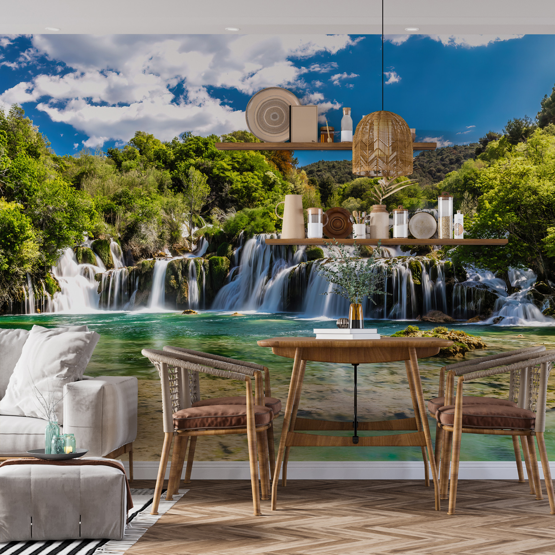 Premeňte akúkoľvek miestnosť na pokojné útočisko s touto úžasnou nástennou maľbou modrej oblohy posiatej nadýchanými oblakmi a žiarivými stromami. Predstavte si, že sa každý deň prebúdzate s jemnou pripomienkou krásy prírody – je to ako preniesť sa do prírody, bez chrobákov. Ideálne sa hodí do útulnej obývačky alebo pokojného zákutia a nabáda k snívaniu a slnečným vibráciám. Navyše je to skvelý podnet na rozhovor. Predstavte si priateľov, ako sa stretávajú, obdivujú vašu “vonkajšiu oázu” a tajne sa čudujú, ako sa vám podaril taký skvelý vzhľad. Je to dotyk prírody, ktorý nikdy nevyjde z módy.