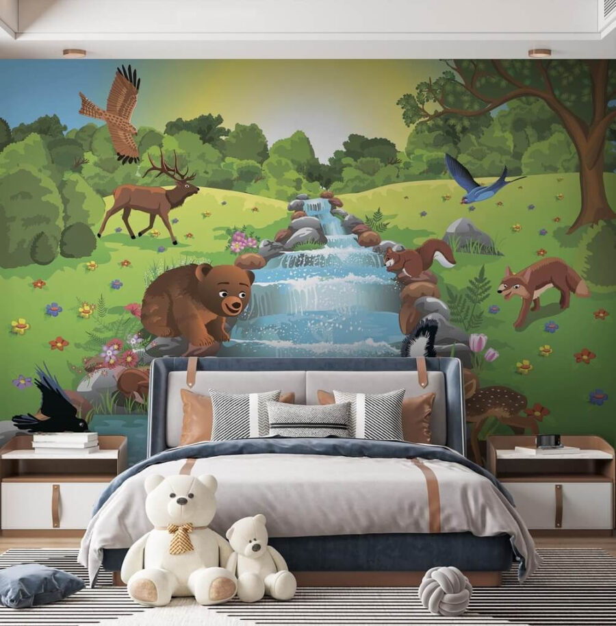 Premeňte svoj priestor na živý les s touto očarujúcou nástennou maľbou, na ktorej sú zobrazené roztomilé zvieratká, ktoré si užívajú slnečný deň pri šumivom potoku. Predstavte si medveďa, ktorý sa brodí vo vode, zvedavého jeleňa, ktorý sa skláňa, aby sa napil, a drzú veveričku, ktorá plánuje svoju ďalšiu desiatu. Táto maľba prináša pocit radosti a tepla, je ideálna do rodinných izieb alebo detských kútikov – je to ako mať priamo vo vašej domácnosti malé dobrodružstvo v divočine! Každý pohľad vám pripomenie jednoduchšie časy, čerstvý vzduch a možno vás dokonca naláka na výlet do prírody. Objavte čaro prírody a nechajte svoje steny rozprávať príbeh!