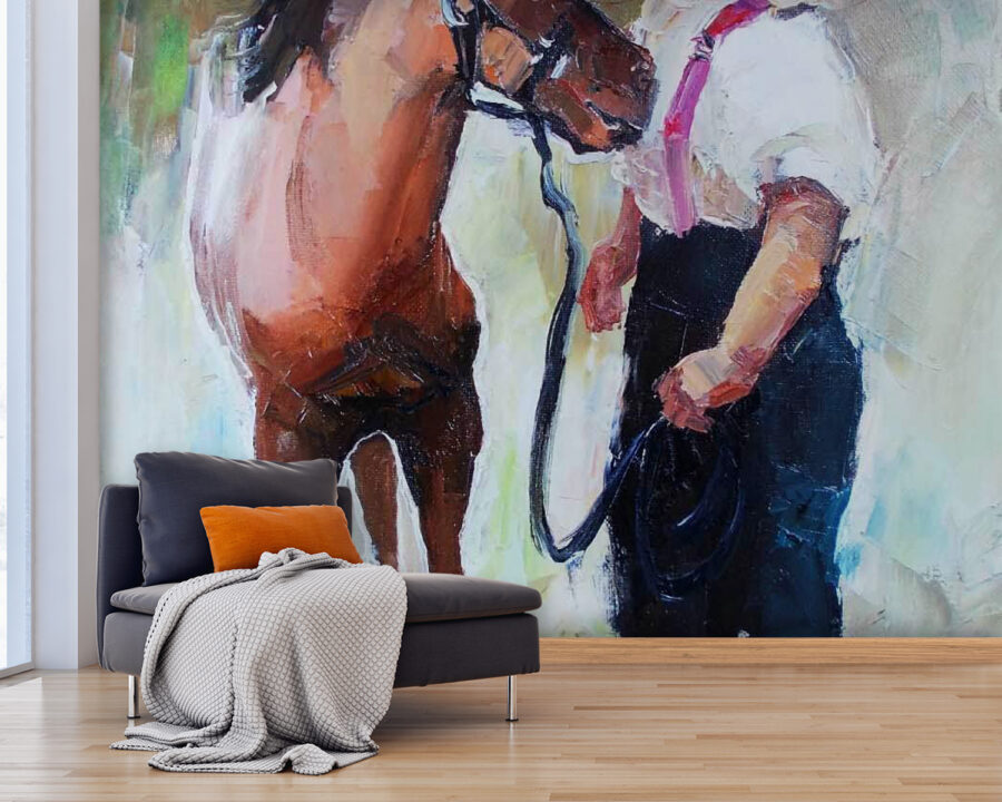 Predstavujeme nástennú maľbu, ktorá zachytáva čistú mágiu – dievča, ktoré sa nežne bozkáva so svojím koňom. Toto umelecké dielo nie je len maľba na stene, je to okno do sveta, kde nevinnosť a priateľstvo kvitnú uprostred jemných ťahov štetcom. Predstavte si, že vstúpite do tohto priestoru a okamžite pocítite povznesenie, ako keby vás v chladný deň objali. Zemité farby sa harmonicky prelínajú a vyvolávajú pocit pokoja a nostalgie. Je ideálna na rozjasnenie detskej izby, dodanie šarmu útulnému kútiku alebo vyvolanie radosti v akejkoľvek miestnosti. Je to nádherná pripomienka, že láska nepozná hranice, ani medzi druhmi! Či už ste milovníkom koní alebo len niekto, kto ocení jedinečný dekor, táto nástenná maľba spieva sladkú melódiu, ktorá rezonuje s srdcom. Kto by sa nechcel každý deň vytešiť z takejto teplej atmosféry?