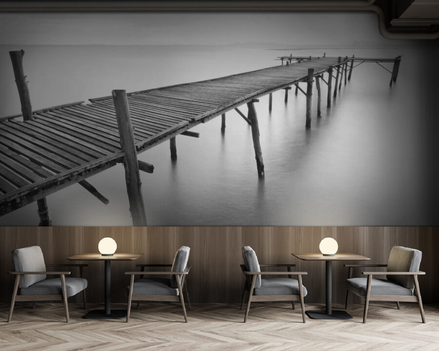 Premeňte svoj priestor pomocou nástennej maľby, ktorá zachytáva pokojné čaro dlhého dreveného mosta tiahnuceho sa ponad pokojné vody. Predstavte si, že stojíte na jeho okraji, zhlboka sa nadýchnete a necháte sa unášať pokojom. Tento ohromujúci kúsok vnáša do interiéru veľkú prírodu a stiera hranice medzi prírodou a interiérovým dizajnom. Perfektne sa hodí do obývacej izby alebo do čitateľského kútika a nabáda k snívaniu o pokojných popoludniach pri vode. Priatelia sa stratia v myšlienkach a budú si želať prechádzku po tomto moste. Je to ako minidovolenka na vašej stene, bez kufra!