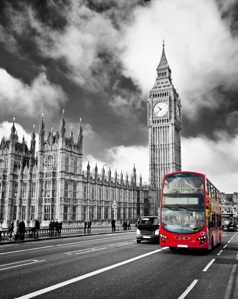 Transform your space with this stunning mural featuring a vibrant red double-decker bus gliding past a majestic clock tower—yes, it’s practically waving you over for a cup of tea! The mix of black-and-white architecture and that pop of red feels like a postcard from London, right on your wall. Imagine friends walking in, eyes lighting up with nostalgia or intrigue. It’s not just decor; it’s a conversation starter, sparking stories about adventures abroad. Get ready to embrace those city vibes every day! Perfect for anyone who loves a dash of whimsy and a sprinkle of charm.