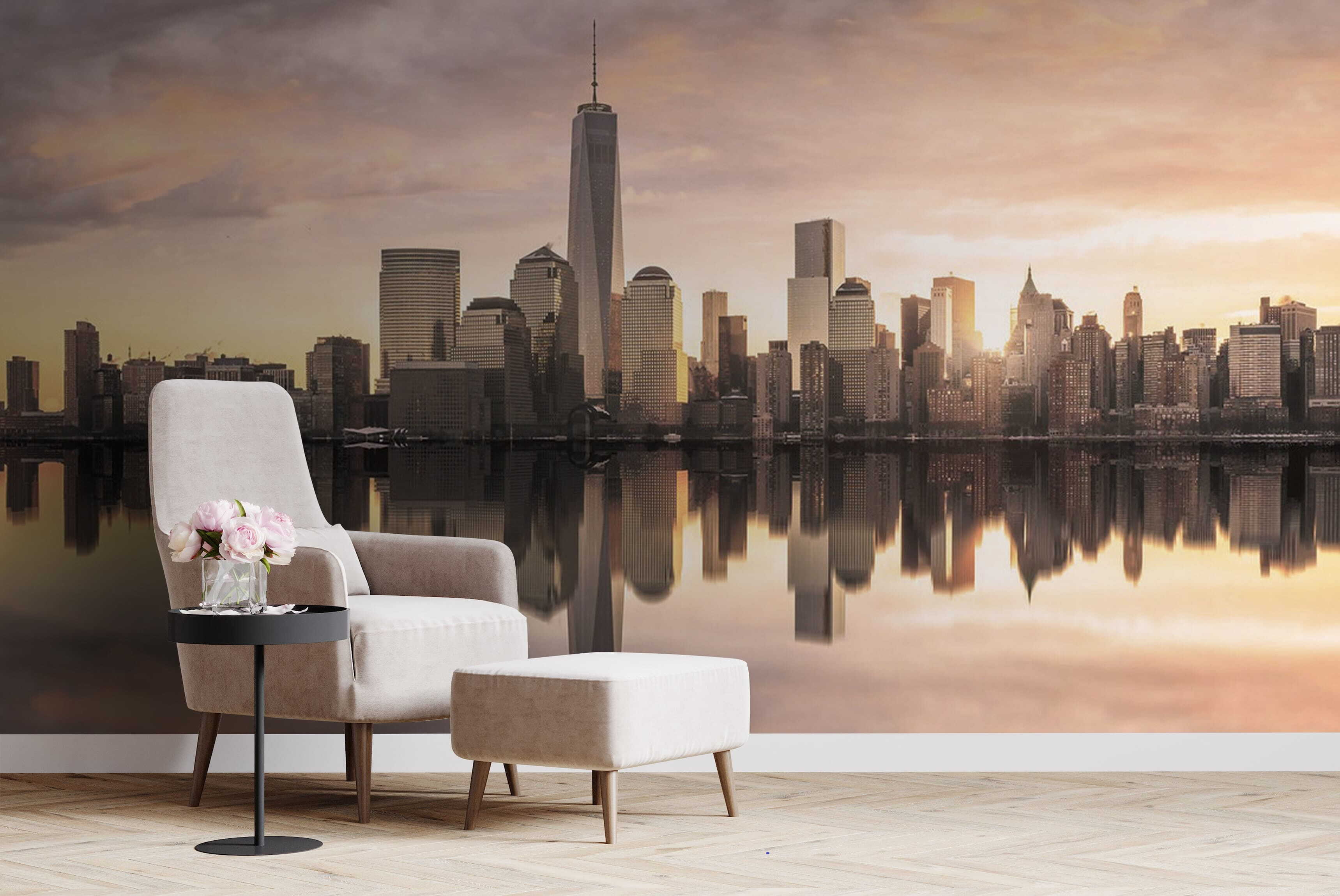 Premeniť miestnosť je také jednoduché ako táto úžasná fototapeta, ktorá zachytáva panorámu mesta odrážajúcu sa v pokojnej vode. Len si to predstavte: jemné vlnky napodobňujú žiarivé budovy v jemnej žiari zapadajúceho slnka. Je to ako priniesť si kúsok mestského kúzla priamo do svojho domova. Predstavte si, že hostíte priateľov a sledujete, ako sa ich tváre rozžiaria, priťahované čarom tejto scény. Táto nástenná maľba šepká príbehy o mestských dobrodružstvách a pokojných chvíľach a vytvára príjemnú atmosféru. Ideálna do útulných obývacích izieb alebo elegantných domácich kancelárií, je to závan čerstvého vzduchu, ktorý vzbudzuje inšpiráciu. Navyše, kto by nemal rád dobré snívanie o živote v meste?