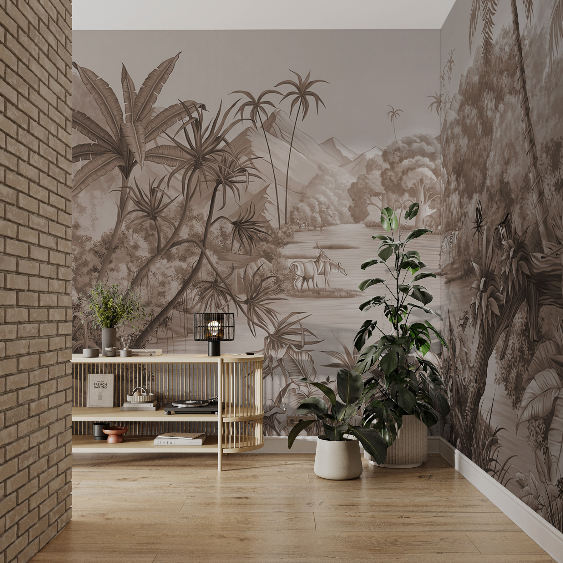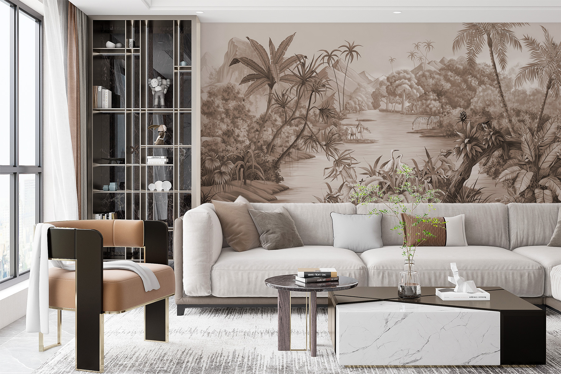 Premeňte akúkoľvek miestnosť na tropický únik s touto úžasnou nástennou maľbou so živou scénou džungle. Predstavte si, ako leňošíte a obklopujú vás zvuky prírody, zatiaľ čo sa pôvabné zvieratá prechádzajú bujnou zeleňou. Zemité tóny a zložité detaily tejto fototapety vytvárajú pokojnú atmosféru, vďaka ktorej sa každý pohľad na ňu bude zdať ako minidovolenka. Ideálna do útulného kútika alebo živej rodinnej izby, pozýva k hrejivosti a dobrodružstvu. Predstavte si, že popíjate kávu a pritom snívate o divokej džungli – kto by to nechcel? Preneste kúsok prírody do interiéru a sledujte, ako vaše steny ožijú!