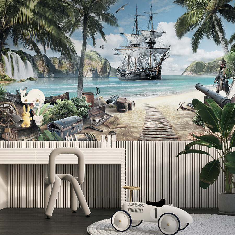 Premeňte akýkoľvek priestor na dobrodružstvo s touto nástennou maľbou pirátskej lode! Predstavte si, že vstúpite do pulzujúcej scény, kde sa kolíšu palmy a lákajú vás tyrkysové vody. Je ideálna pre deti alebo mladých ľudí, ktorí majú srdce, a nabáda k snívaniu o hľadaní pokladov a plážových eskapádach. Predstavte si deti, ako sa pozerajú s otvorenými očami a plánujú imaginárne plavby na palube lode. Medzitým hravé detaily, ako sú hrdzavé sudy a drzý papagáj, vyvolávajú radosť a smiech. Táto nástenná maľba je viac než len dekorácia; je to vstupenka do rozmarného sveta, kde každý pohľad vyvoláva úsmev a nádych dobrodružstva.
