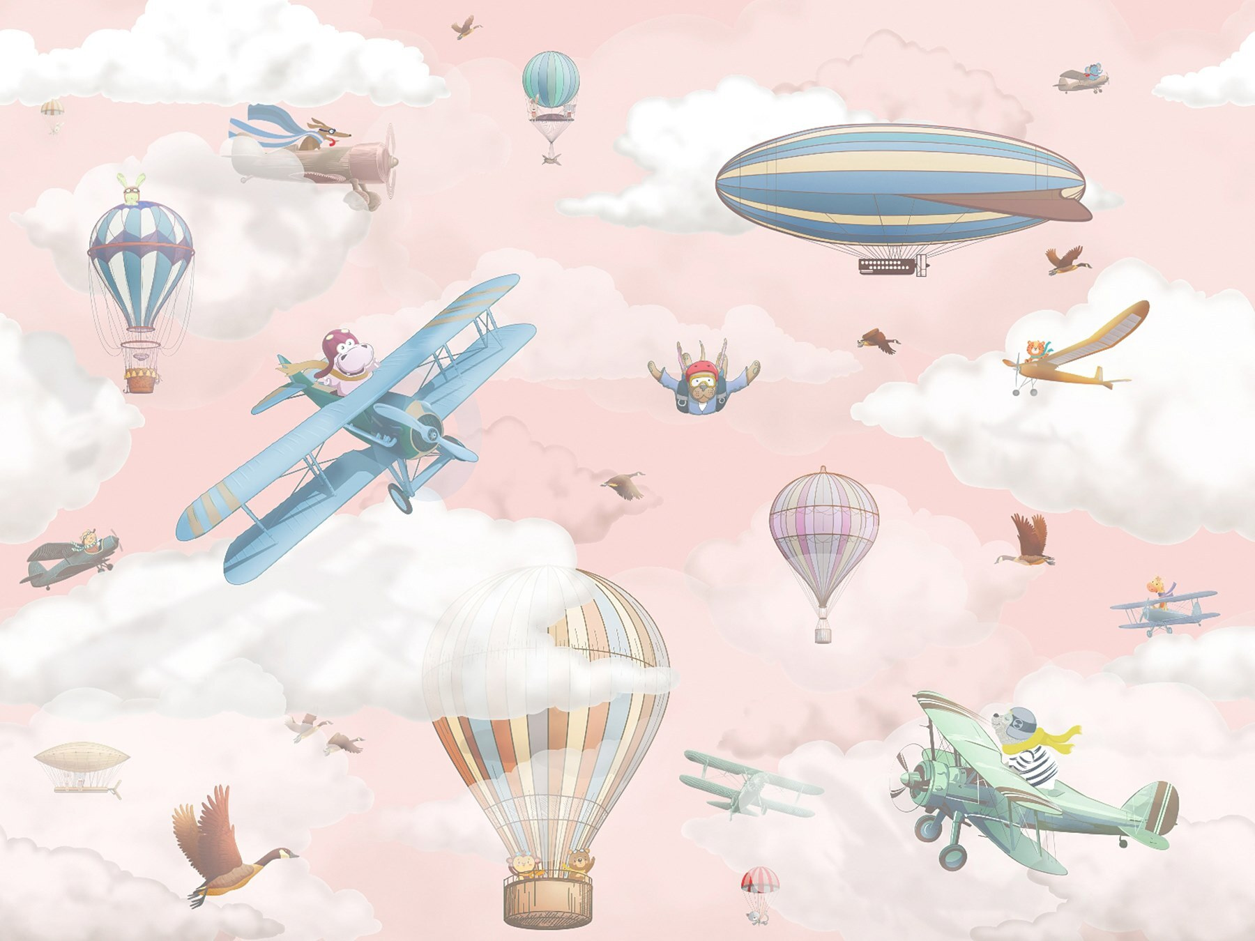 Premeňte akýkoľvek priestor na rozmarný únik s touto nádhernou nástennou maľbou s lietadlami a teplovzdušnými balónmi, ktoré sa vznášajú v nadýchaných oblakoch. Predstavte si, že vojdete do miestnosti a namiesto obyčajných stien vás privítajú farebné lietadlá a roztomilé zvieratká vznášajúce sa na zasnenej oblohe. Je to ako malé sladké dobrodružstvo každý deň! Tento dizajn je ideálny do detskej izby alebo útulného zákutia a dodáva mu hravé čaro, ktoré podnecuje predstavivosť. Jemné pastelové farby udržujú upokojujúce prostredie, vďaka čomu sa pri nich ľahko relaxuje. Kto by sa neusmieval na opičieho pilota alebo malého odvážneho parašutistu? Táto nástenná maľba nie je len dekoráciou – je jemnou pripomienkou, aby ste snívali vo veľkom a nechali kreativitu vzlietnuť!