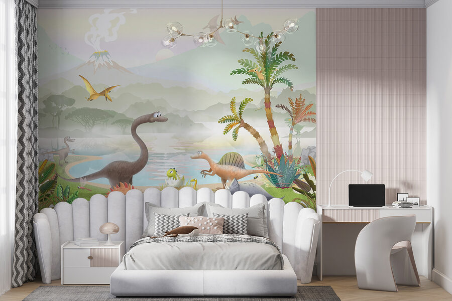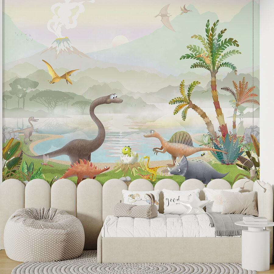 Hľadáte niečo, čo by v detskej izbe vyvolalo vzrušenie? Pozrite si túto rozkošnú fototapetu s pterodaktylom, ktorý lieta vysoko nad kresleným svetom dinosaurov. Predstavte si to: živé dinosaury potulujúce sa okolo, bujné prehistorické rastliny a dymiaca sopka v pozadí – je to ako vstúpiť do farebného stroja času! Deti si zamilujú ukazovanie svojich obľúbených dinosaurov a predstieranie, že lietajú spolu s pterodaktylom. Je ideálny na rozvíjanie predstavivosti a pridanie zábavného farebného nádychu do každej izby. Budete najúžasnejší rodič v bloku!