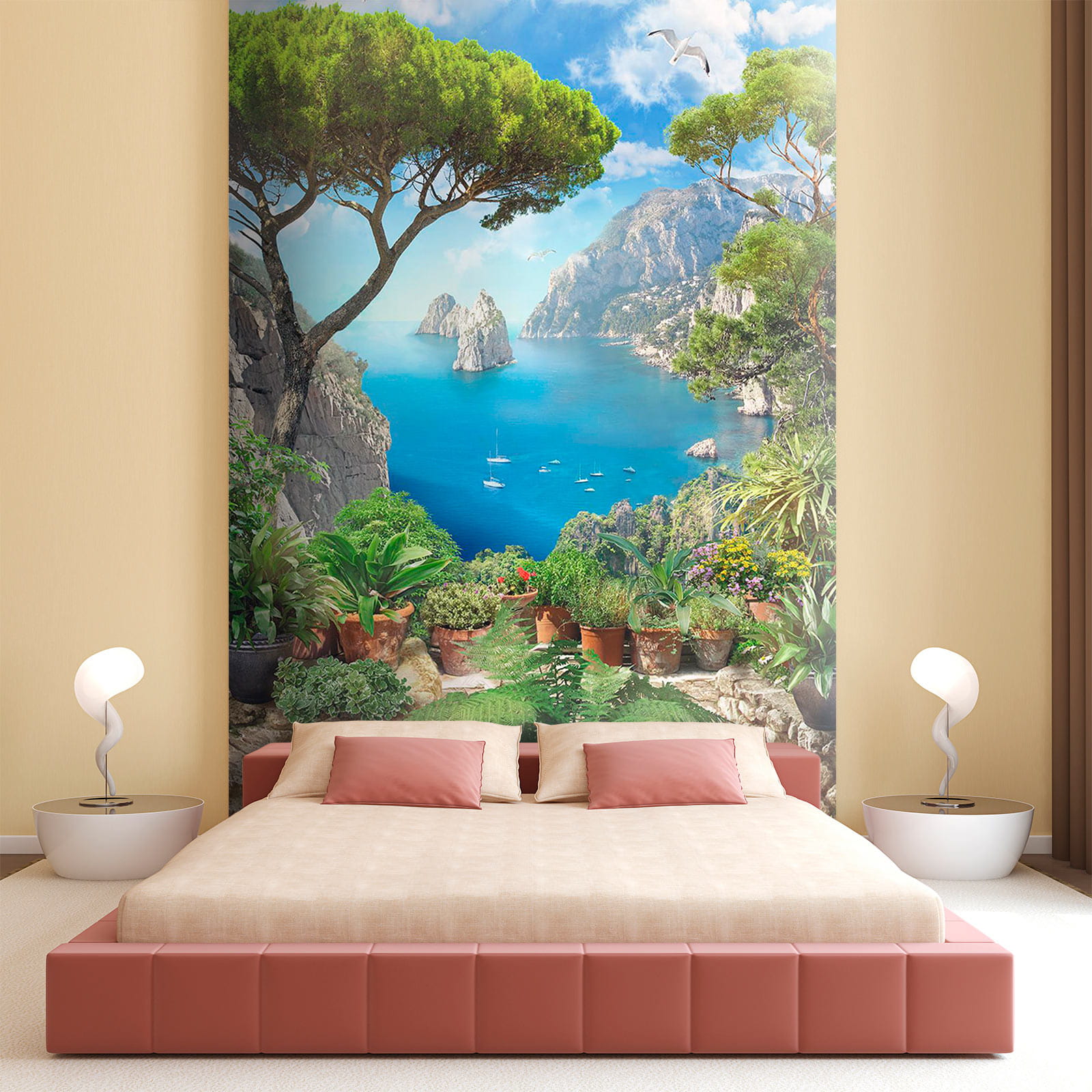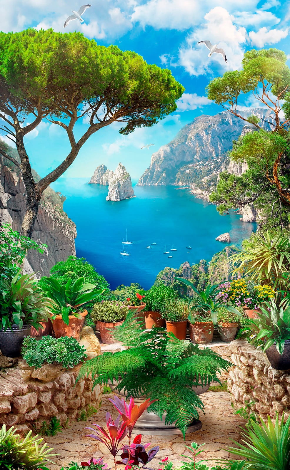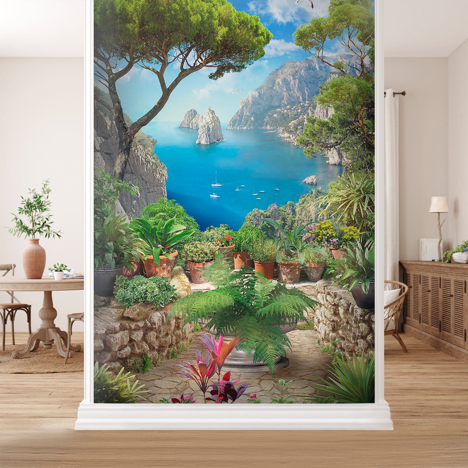 Transform a dull wall into a breathtaking escape with this stunning mural, “View of the Ocean from a Cliff.” Picture yourself sipping coffee while soaking in vibrant blues and lush greens, as if you’re peering over a cliff at the sparkling sea. This mural’s like a mini vacation every day! It captures the beauty of nature with charming potted plants adding that cozy touch. Imagine the birds chirping and that salty breeze wafting in—okay, maybe not, but a girl can dream, right? Perfect for living rooms or cozy nooks, this piece invites daydreams of serene shores and gentle waves.