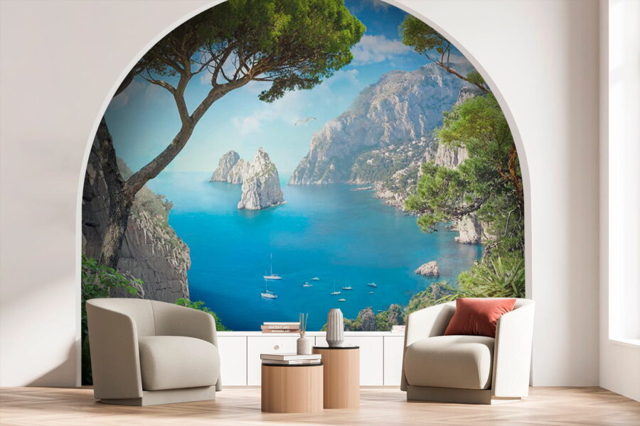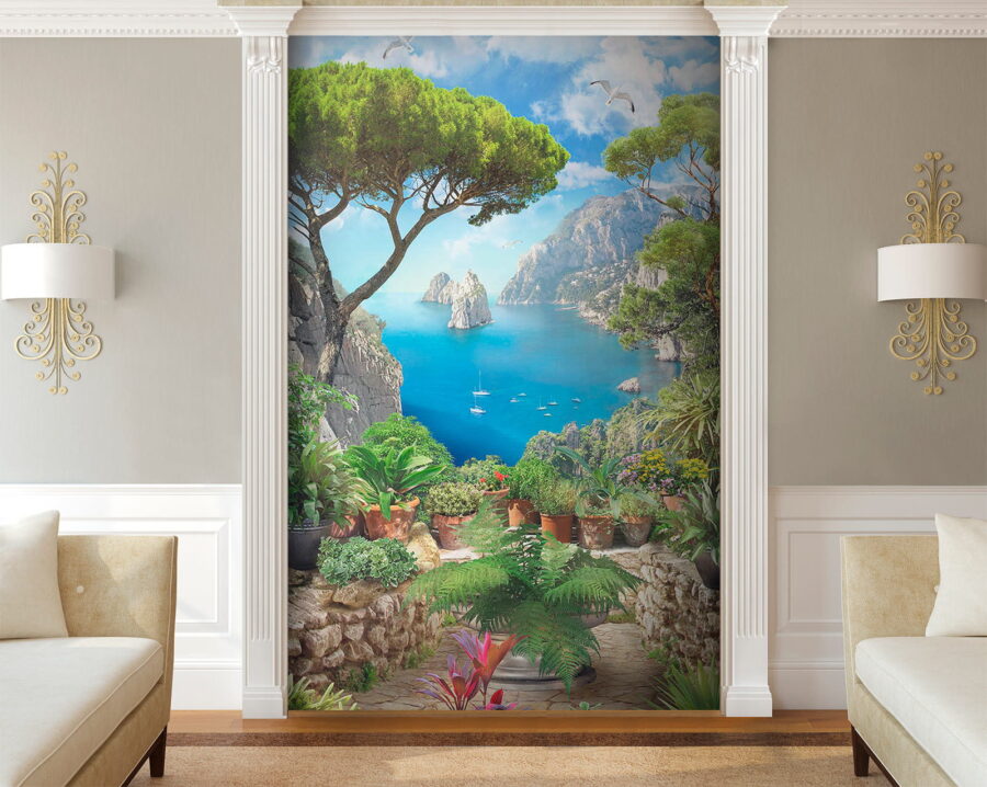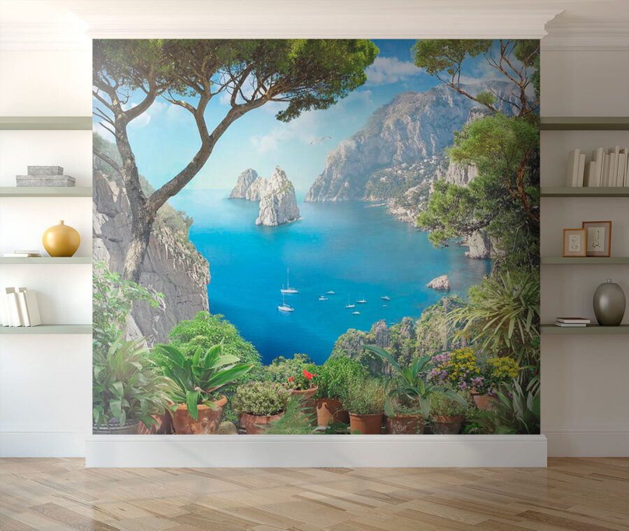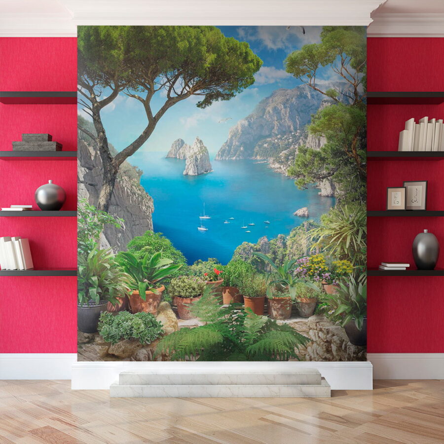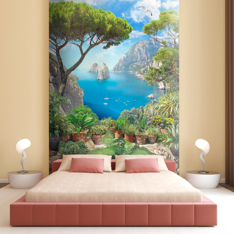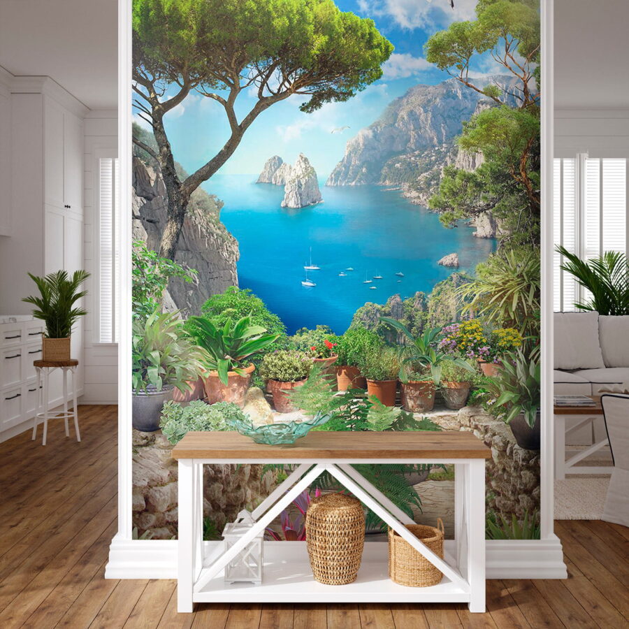 Premeňte nudnú stenu na úchvatný únik s touto ohromujúcou nástennou maľbou „Pohľad na oceán z útesu“. Predstavte si, ako popíjate kávu a kocháte sa žiarivými odtieňmi modrej a sviežou zeleňou, ako keby ste sa pozerali z útesu na trblietajúce sa more. Táto nástenná maľba je ako malá dovolenka každý deň! Zachytáva krásu prírody s očarujúcimi kvetináčmi, ktoré dodávajú útulný nádych. Predstavte si spev vtákov a slaný vánok, ktorý vám ovieva tvár – no dobre, možno nie, ale dievča môže snívať, nie? Táto tapeta je ideálna do obývacích izieb alebo útulných kútikov a vyvoláva predstavy o pokojných brehoch a jemných vlnách.
