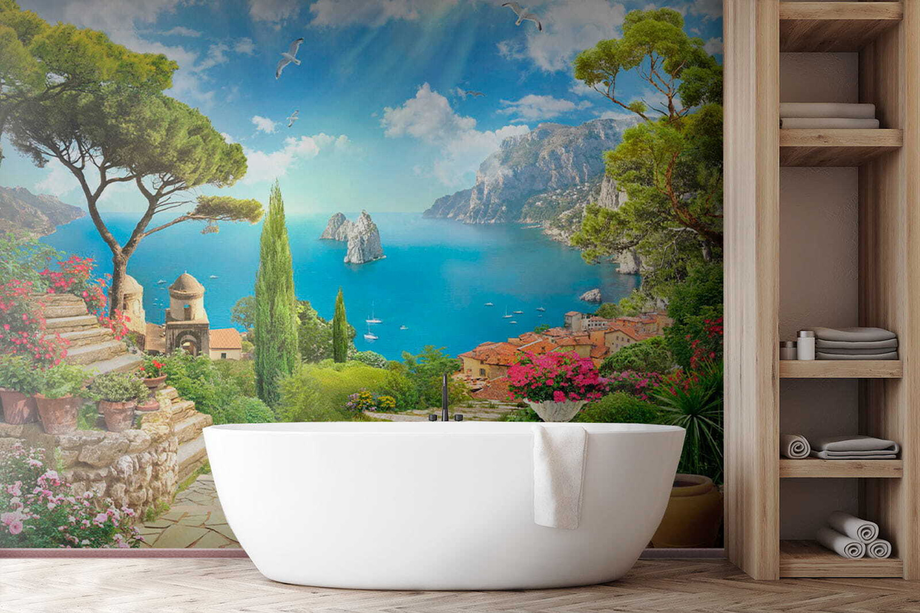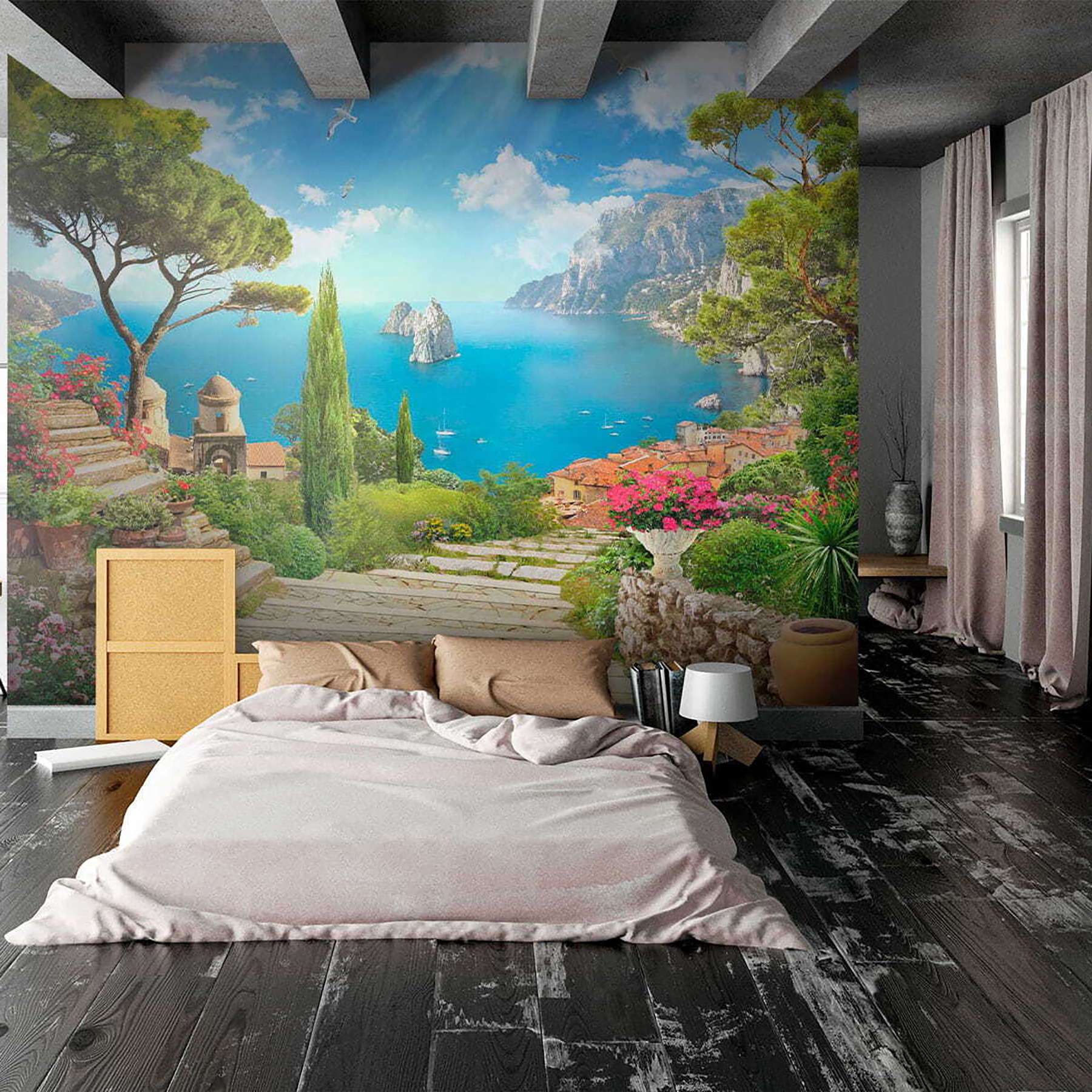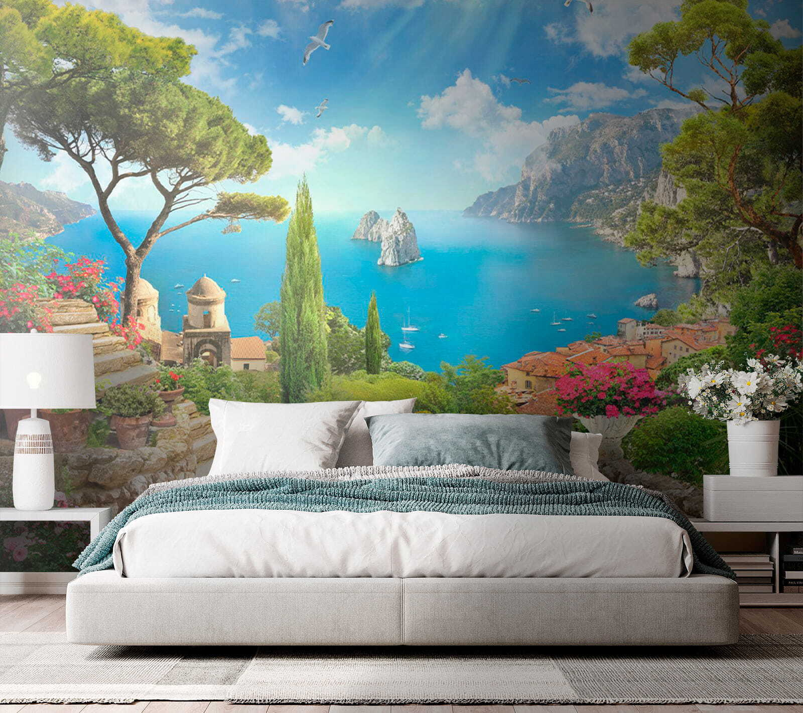 Predstavte si to: vchádzate do svojej obývačky, ale počkajte – namiesto toho vás privíta nádherný výhľad na more. S nástennou maľbou “Vták letí v oblakoch” sa vaše steny poriadne rozžiaria. Je to ako pridať okno s výhľadom priamo na Stredozemné more s nádychom fantázie. Predstavte si žiarivú zeleň, očarujúce kamenné cestičky a vysoko sa vznášajúce vtáky.