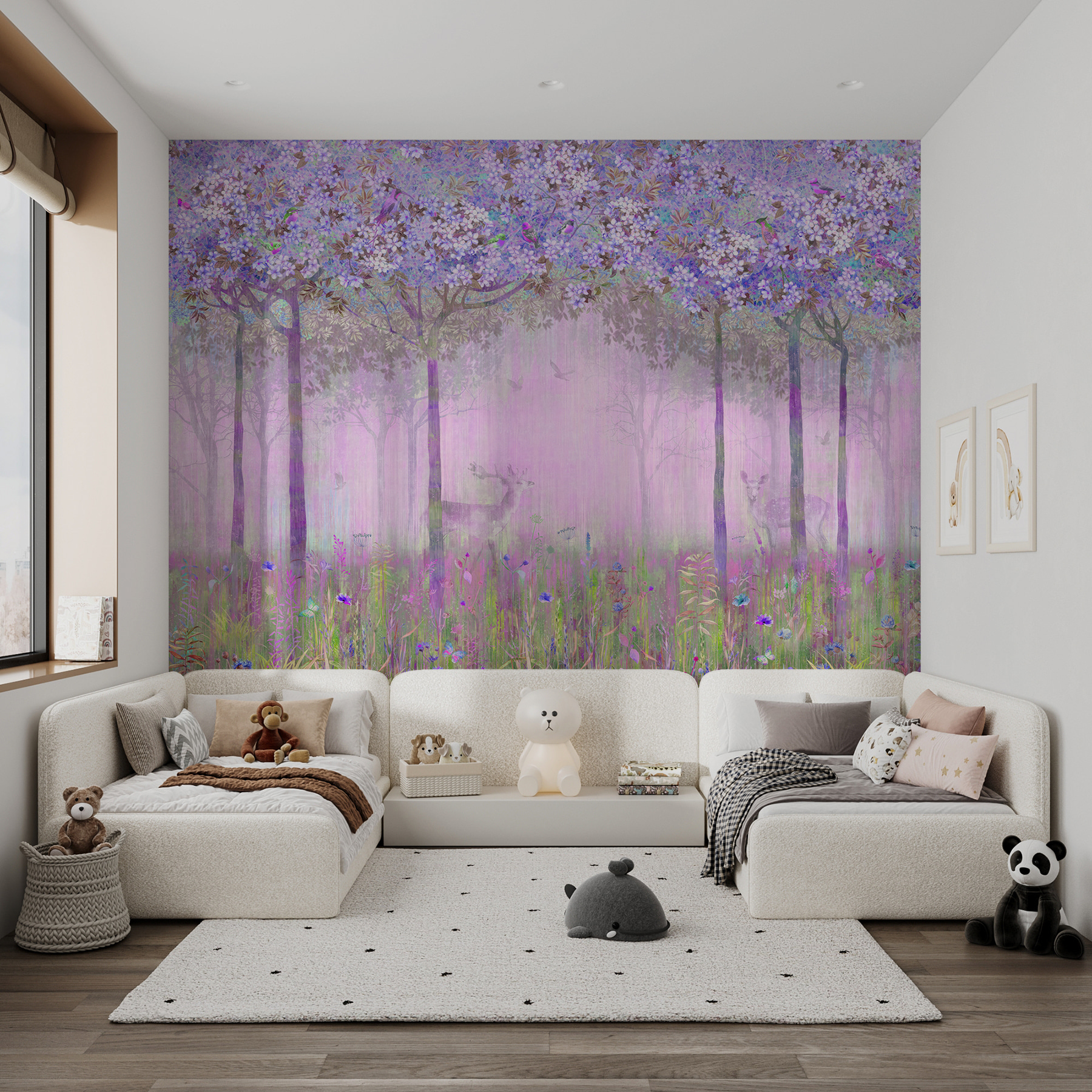 Ak chcete do miestnosti vniesť kúzlo a rozmar, táto nástenná maľba kvetov a trávy je ako stvorená. Predstavte si, že pri každom vstupe do miestnosti vstúpite do rozprávkového lesa. Táto nástenná maľba, zaliata jemnou levanduľou a jemnou zeleňou, pôsobí ako pokojné jarné ráno. Takmer počujete šumenie listov a vidíte srnky, ktoré vykúkajú cez hmlu.
