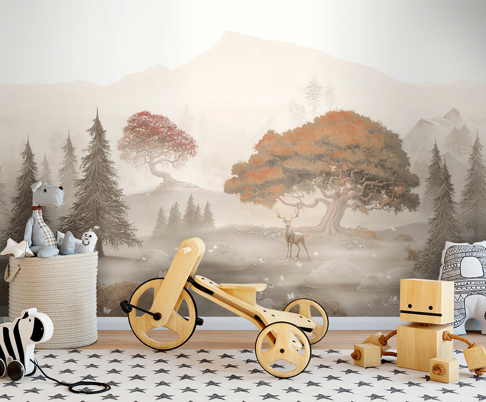 Imagine stepping into a dreamy forest without leaving your living room. This wall mural, with its soft hues of trees and distant mountains, transports you to a serene world where nature reigns. Picture a lazy afternoon, sipping coffee while butterflies flutter around and deer graze peacefully. It’s like having a mini escape every day! The vibrant colors, especially that striking red tree, pop against the misty background, creating a cozy vibe. It transforms any space into a sanctuary. So go ahead, let your walls tell a story of tranquility. Wouldn’t that be just lovely?