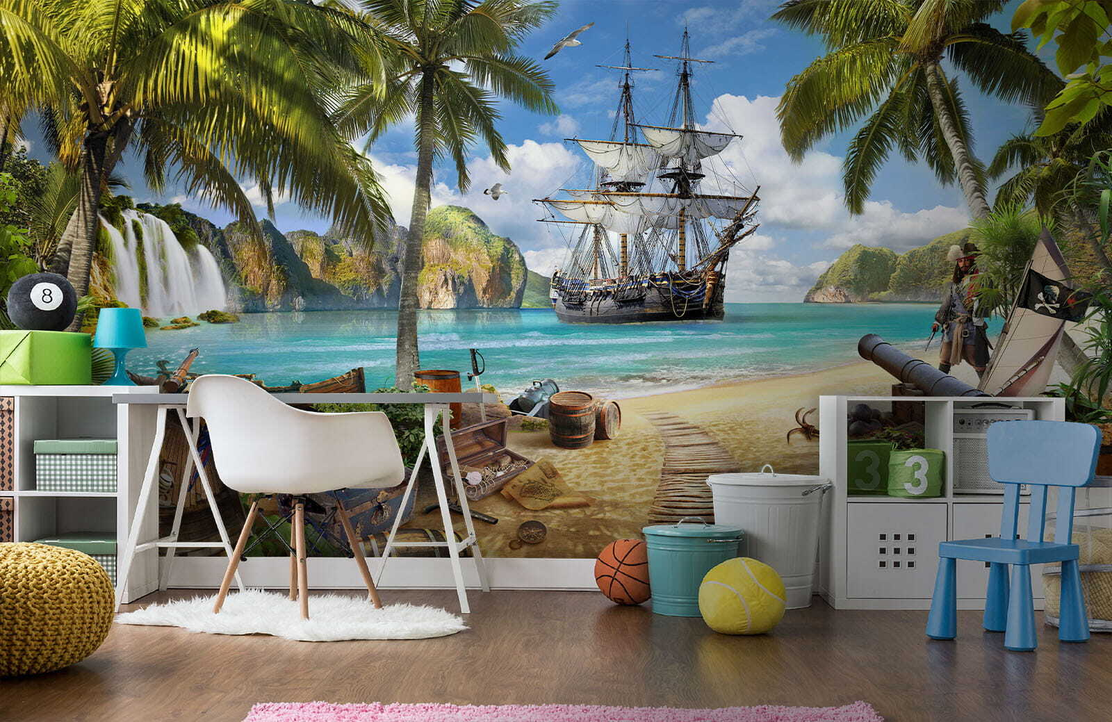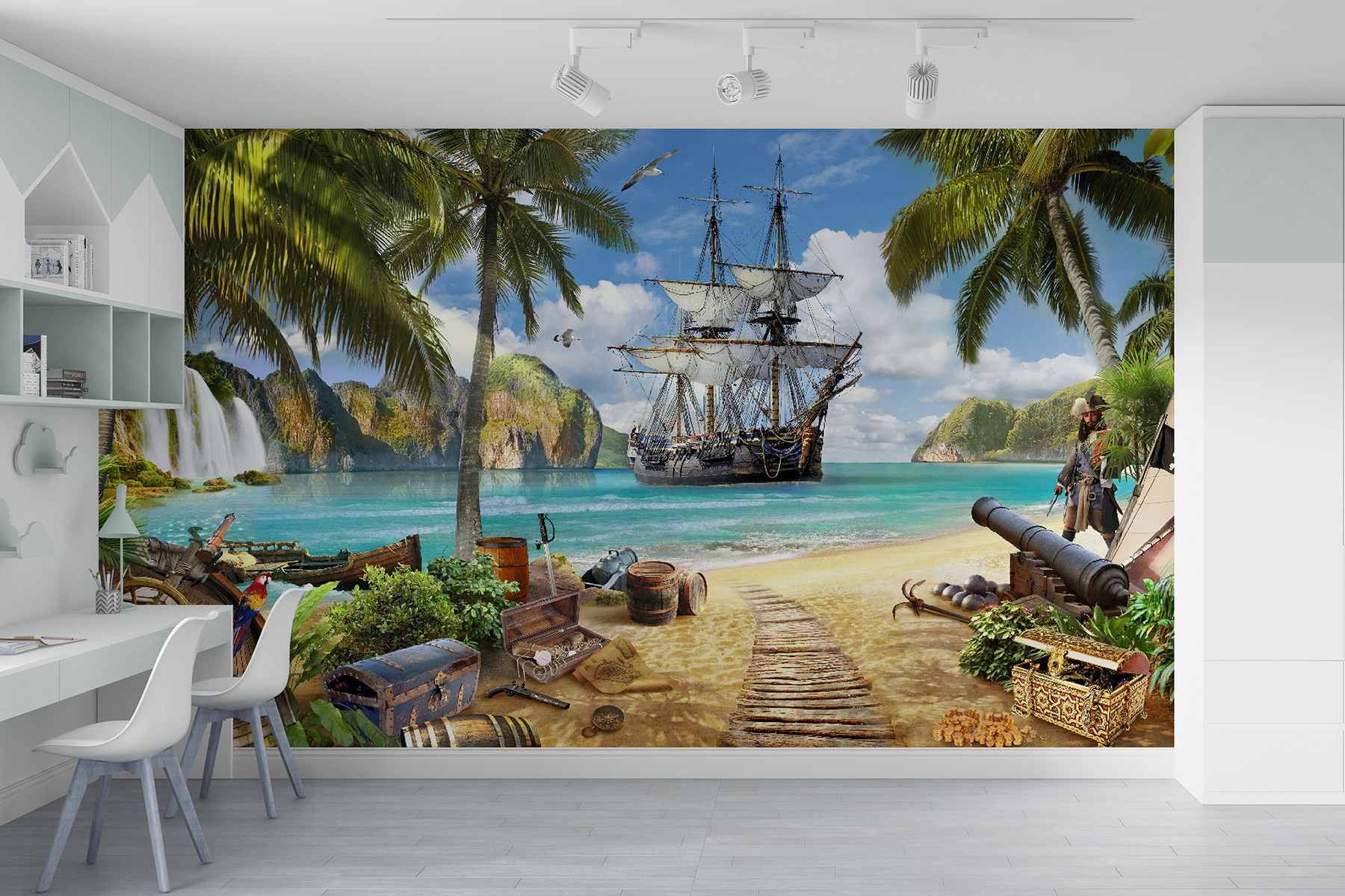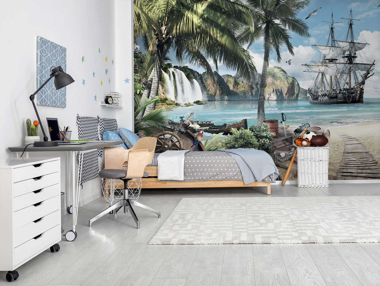 S nástennou maľbou “Pirátska loď ukotvená v tropickom raji” premeníte akýkoľvek priestor na slnkom zaliaty raj. Predstavte si, že vstúpite do sveta, kde vám morský vánok jemne ovieva tvár a nad vami sa kolíšu žiarivé palmy. Táto nástenná maľba oživuje úžasnú scénu – dobrodružnú pirátsku loď zakotvenú pri krištáľovo čistých vodách, obklopenú pokladmi a bujnou prírodou. Deti budú mať pocit, že sú súčasťou dobrodružnej plavby, objavujú skryté poklady a tajné ostrovy. Je to viac než len dekorácia; je to iskra pre tvorivosť, inšpirujúce príbehy a nekonečné sny. Kto by nechcel odplávať zakaždým, keď sa pozrie na svoju stenu? Táto nástenná maľba je ideálna do detských izieb alebo spální a vytvára očarujúci únik, ktorý určite vyčarí úsmev na tvári každému. Nechajte fantáziu vyplávať!