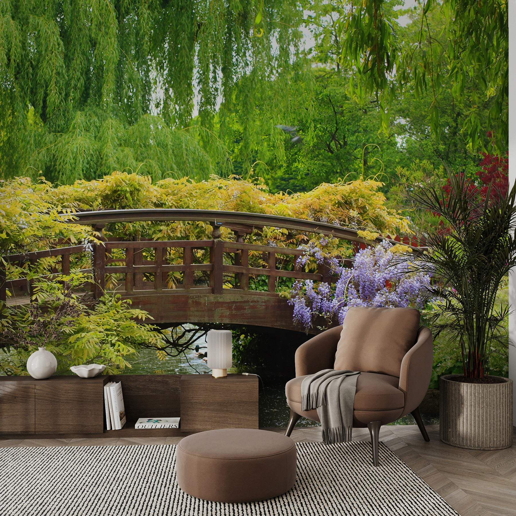 Premeňte svoj priestor pomocou tejto očarujúcej nástennej maľby “Most cez vodu so stromami a rastlinami”. Predstavte si, že vstúpite do pokojnej záhrady, kde živá zeleň a pestré farby tancujú okolo očarujúceho mosta. Je to ako pozvanie do tajnej oázy priamo vo vašej obývačke!