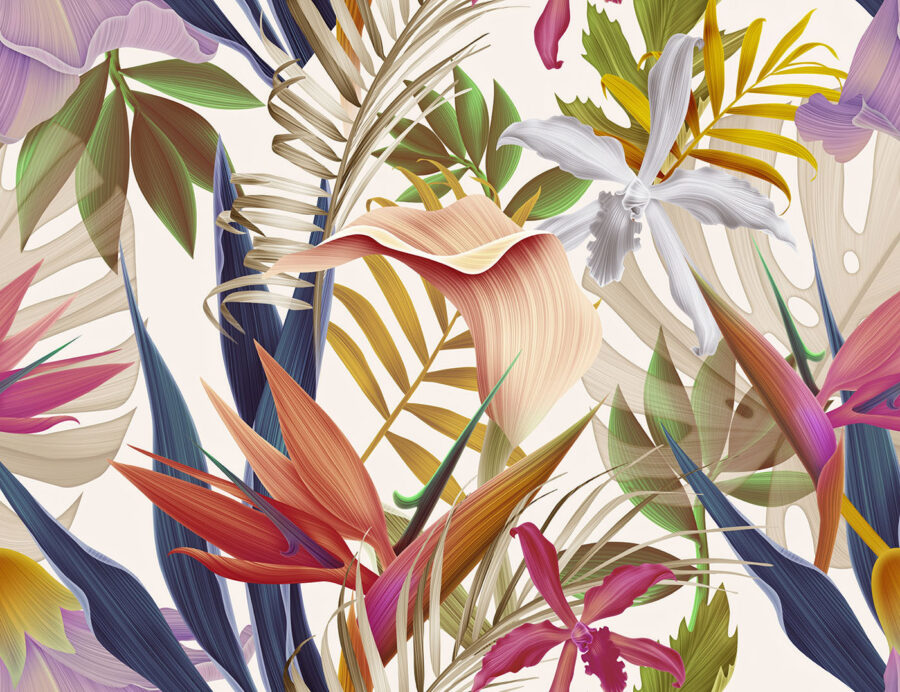 Fototapety Farebné tropické listy a kvety Fototapety Farebné tropické listy a kvety