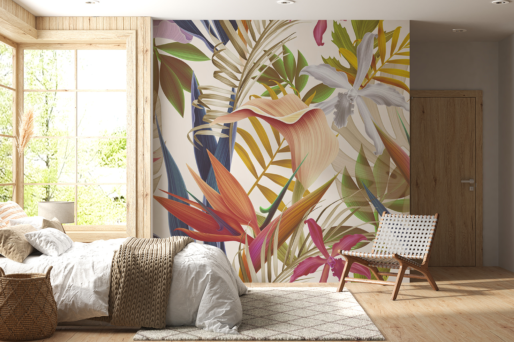S touto oslnivou fototapetou s farebnými tropickými listami a kvetmi premeníte každú miestnosť na žiarivý raj. Predstavte si to – vstúpite do svojho priestoru a budete mať pocit, že ste práve zablúdili do sviežej záhrady. Sýte odtiene vyniknú na akomkoľvek pozadí a vytvoria príťažlivú atmosféru, ktorej je ťažké odolať.