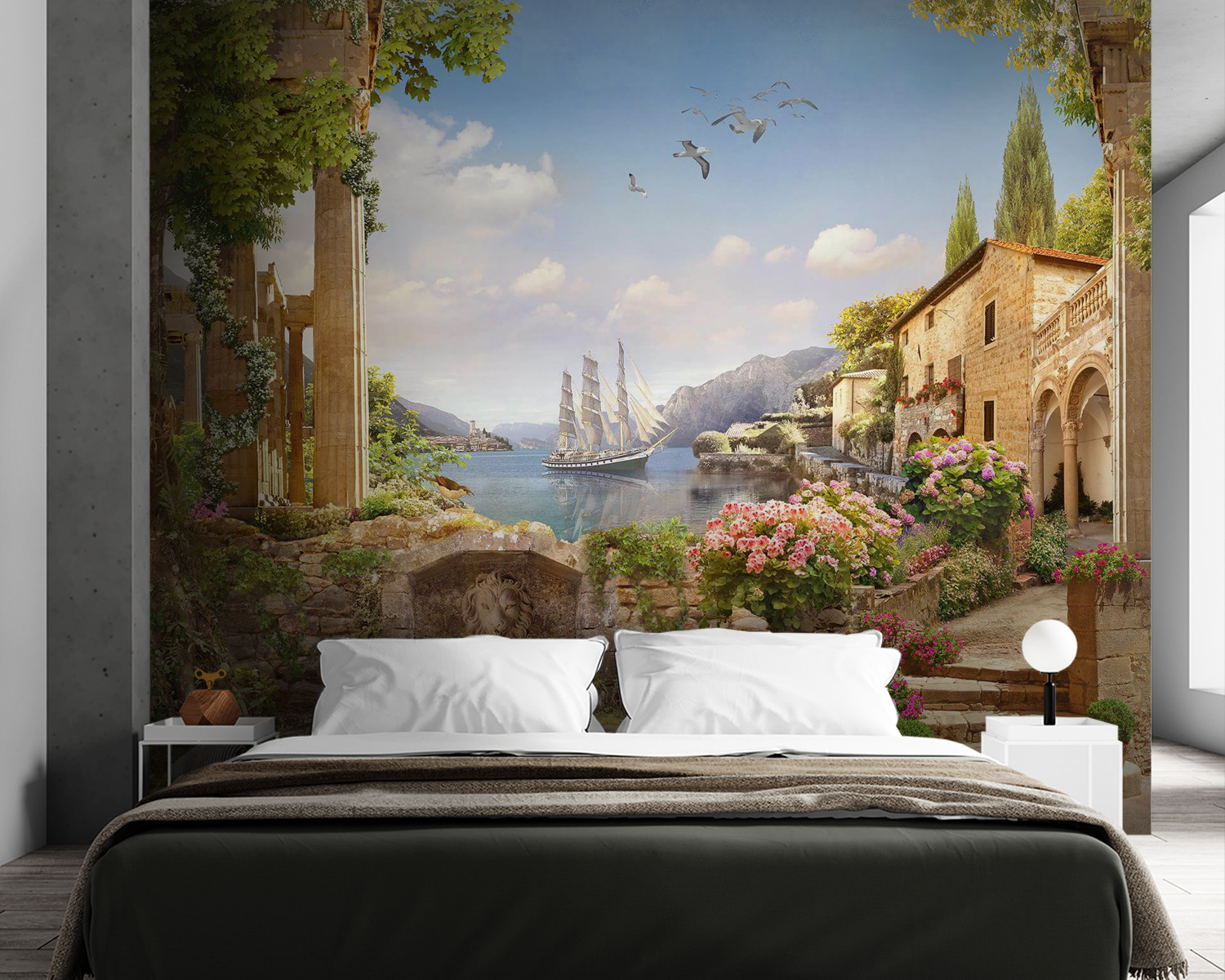 Vstúpte do zasneného úniku s touto úžasnou nástennou maľbou s kamennou budovou obklopenou pokojnými vodami. Predstavte si to: dni zaliate slnkom a jemný vánok, ako sa okolo vás plaví pôvabná loďka, zatiaľ čo farebné kvety sa rozlievajú po okrajoch starnúceho kameňa. Atmosféra? Čistý pokoj. Táto nástenná maľba prináša do interiéru kúsok prírody, vďaka ktorej sa každá miestnosť bude cítiť ako útulný únik. Priatelia sa vás možno dokonca opýtajú, či ste svoj priestor premenili na očarujúce prímorské útočisko! Je ideálna na vyvolanie pocitov túlania, a to všetko v útulnom prostredí domova. Premeňte svoje steny a nechajte dobrodružstvo začať!