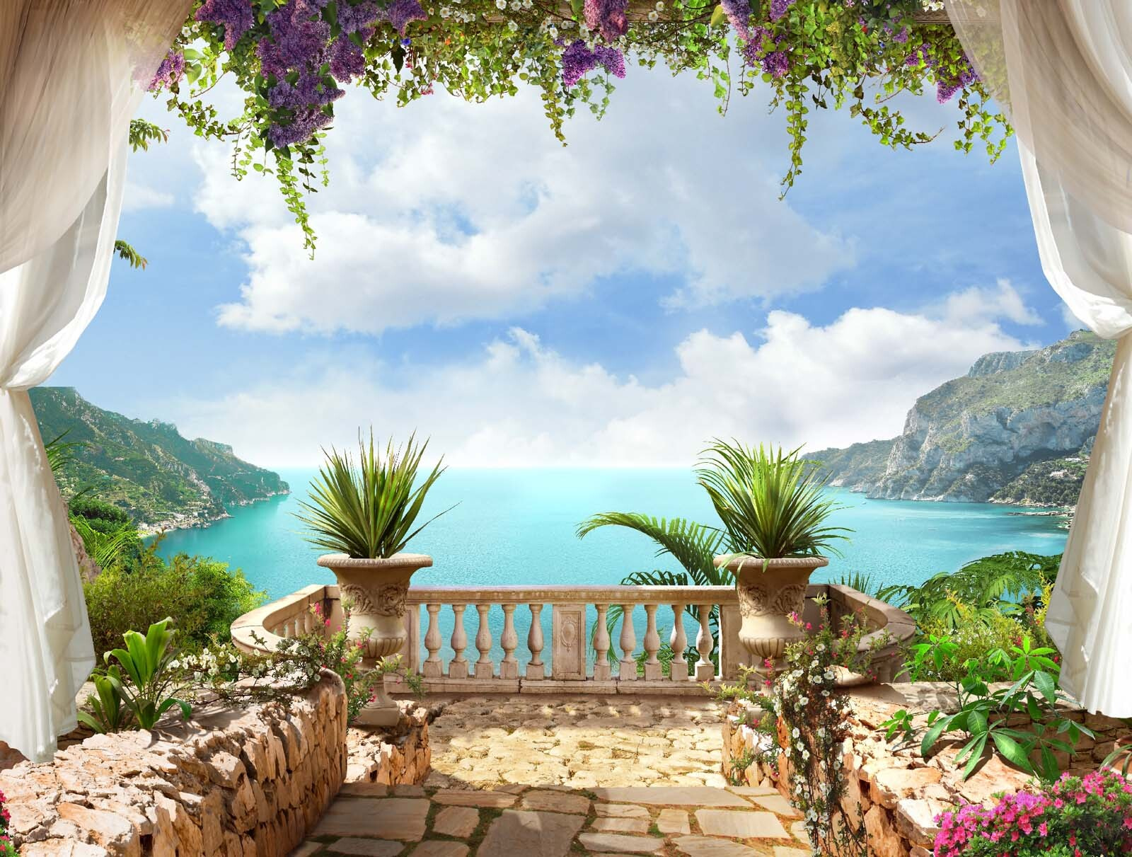 Predstavte si, že vstúpite do miestnosti a BUM – táto nástenná maľba vás prenesie na zasnenú stredomorskú terasu s bujnými rastlinami, šumiacim modrým morom a nekonečnou oblohou, pri ktorej sa vám chce zhlboka dýchať. Je to ako minidovolenka bez letenky a opaľovacieho krému. Stačí ju zavesiť a zrazu sa váš priestor zdá byť väčší, svetlejší a oveľa viac zenový. Tie rastliny v kvetináčoch? Dodávajú tomu taký očarujúci, takmer filmový nádych, akoby ste boli v nejakej tajnej záhrade z rozprávky. Úprimne povedané, je to ideálne pre každého, kto chce každodennú dávku “wow” bez údržby skutočného záhradníctva. Dokonalá kombinácia prírody a úniku.