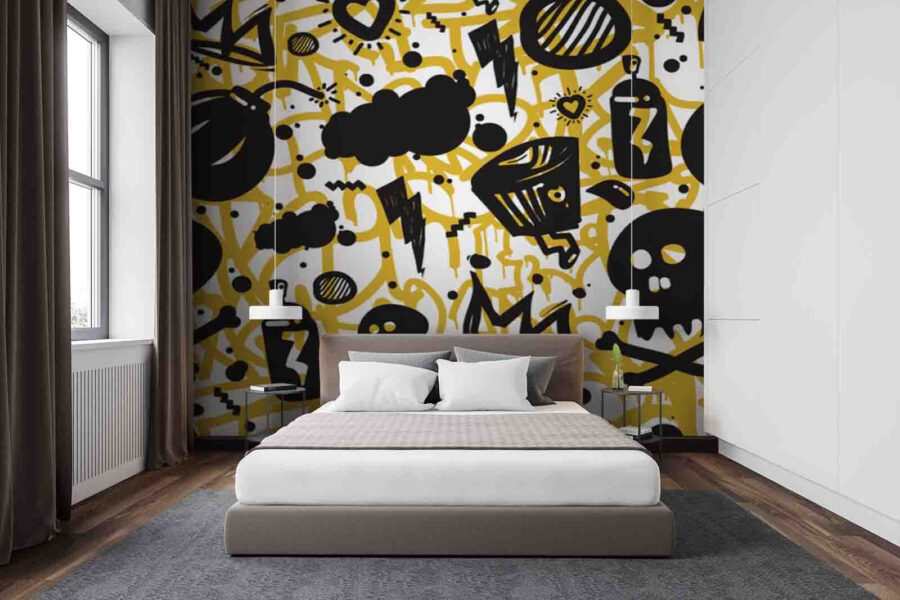 This wall mural is like a visual party, bursting with personality and creative energy. Picture this: the vibrant yellow backdrop jumps out at you, while funky black doodles, from cute skulls to zany crowns, dance across the surface. It’s edgy yet playful—perfect for anyone looking to inject some serious fun into their space. Imagine hosting friends, and they can’t help but chat about this mural, snapping photos like it’s the star of the show. It’s not just decor; it sparks joy and conversation! Hang it up, kick back, and watch your walls come alive with character. Who knew a little graffiti could transform a room into a playful wonderland?
