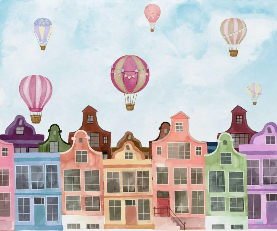 Bring a slice of whimsy home with this stunning wall mural, “Group of Buildings with Hot Air Balloons.” Imagine stepping into a world where colorful houses stand proudly, with those playful balloons dancing overhead. It’s like that dreamy vacation spot you’d love to visit, right in your living room. The watercolor vibe adds a light touch that can brighten any space, making it feel a bit more cheerful.