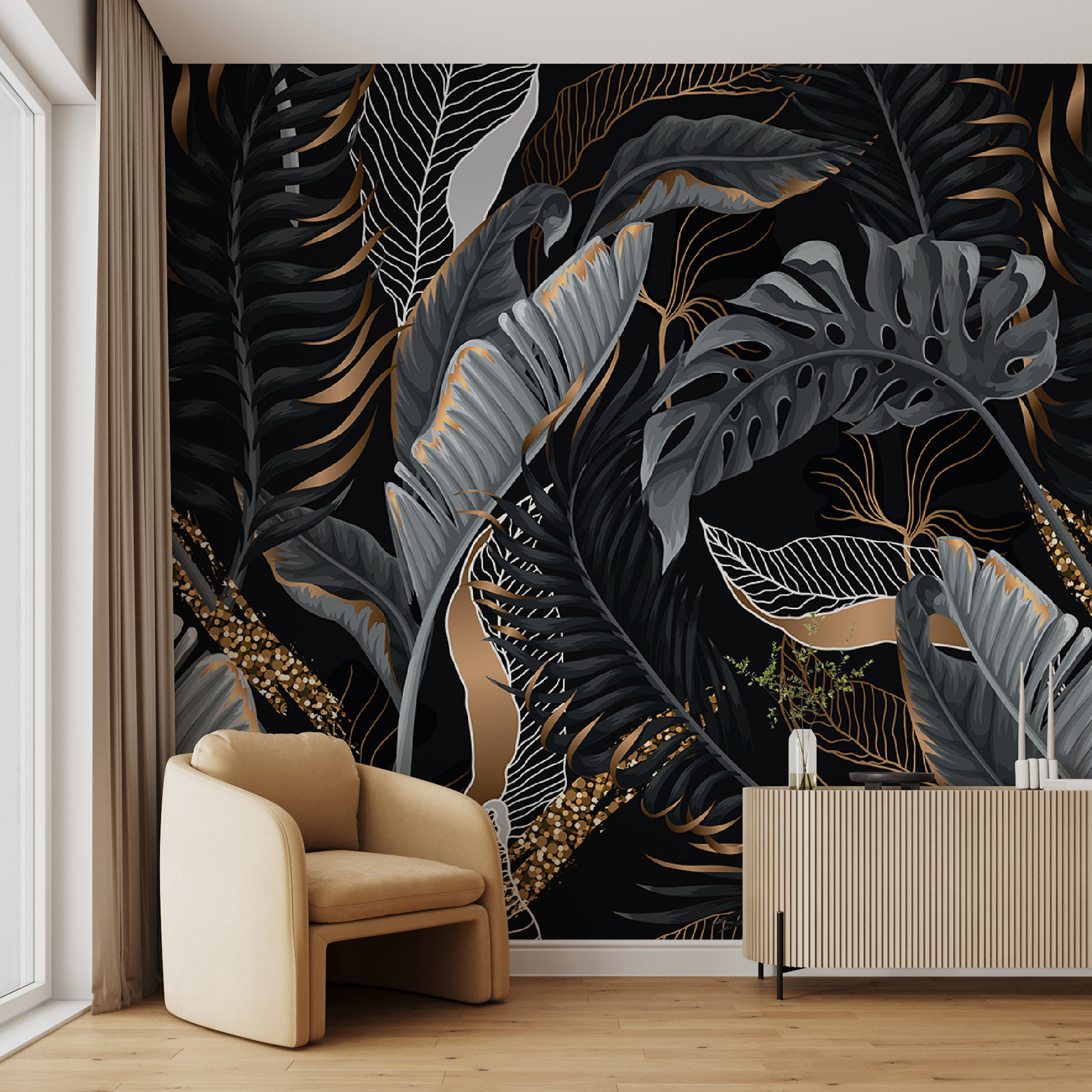 Premeňte svoj priestor pomocou tejto úžasnej nástennej maľby s elegantnými tropickými listami na tmavom pozadí. Predstavte si, že sa každý deň prebúdzate obklopení touto sviežou zeleňou, akoby ste vstúpili do pokojného lesa – no bez chrobákov! Je ideálny na vytvorenie príjemnej, útulnej atmosféry. Predstavte si lenivé víkendy pri popíjaní kávy a kochajte sa krásou týchto zložitých listov. Kontrast tmavej a svetlej farby dodáva dramatickosť bez toho, aby vás ohromil; je to, akoby sa príroda rozhodla usporiadať malú elegantnú párty priamo na vašej stene. Skvele sa hodí do obývacích izieb, spální alebo do tichého čitateľského kútika, ktorý potrebuje len trochu extra atmosféry. Prečo sa uspokojiť s obyčajnou farbou, keď môžete mať mini džungľový únik?