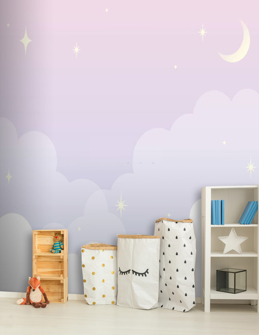 Predstavte si priestor, v ktorom môže vaše dieťatko snívať medzi tými najjemnejšími obláčikmi – nástenná maľba u72088 posunie každú detskú izbu alebo detskú izbu na úplne novú úroveň! Vďaka jemným pastelovým farbám, ktoré sa prelínajú do súmračnej oblohy posiatej trblietajúcimi sa hviezdičkami a nežným polmesiacom, je to ako bývať v uspávanke. Táto nástenná maľba, upokojujúca a očarujúca, vytvára dokonalú pokojnú atmosféru na rozprávky pred spaním alebo popoludňajší spánok. Nie je to len dekorácia – je to pozvánka na predstavivosť! Stačí jeden pohľad a možno si budete priať byť opäť dieťaťom, len aby ste mohli zaspať pod touto pokojnou oblohou. Útulné, krásne a trochu magické… Takmer sa o tom sníva!