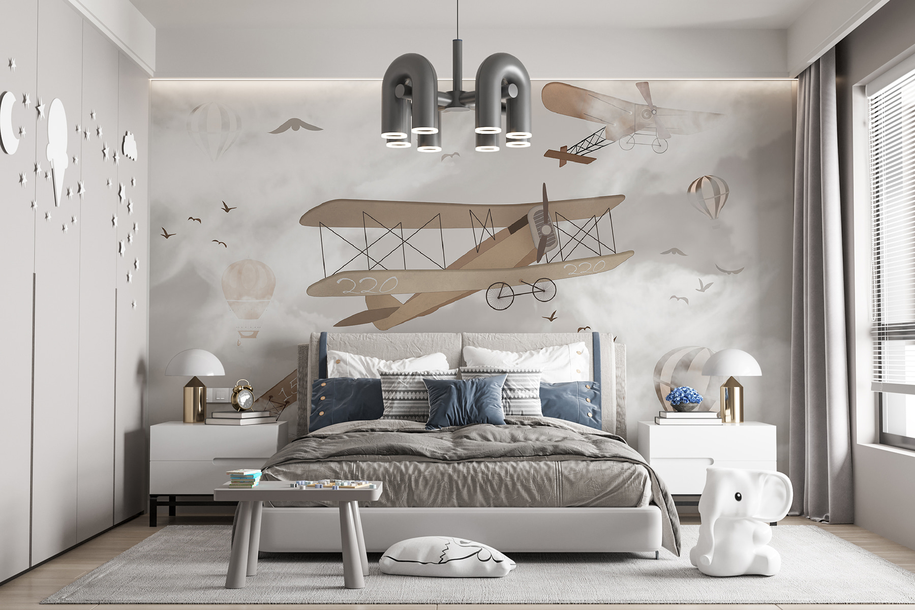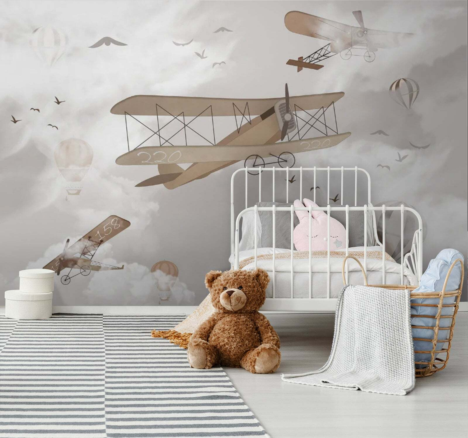 Predstavte si, že sa vznášate vysoko nad oblakmi s touto očarujúcou nástennou maľbou “Horkovzdušný balón v oblakoch”. Táto nástenná maľba je ideálna do detských izieb alebo pre každého, kto má mladé srdce, pretože jej rozmarný dizajn zobrazuje teplovzdušné balóny a historické lietadlá tancujúce medzi mrakmi – úplne snový! Predstavte si, že sa každý deň budíte s týmto výjavom, akoby ste boli na nekonečnom dobrodružstve.