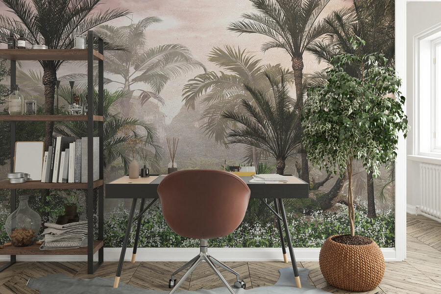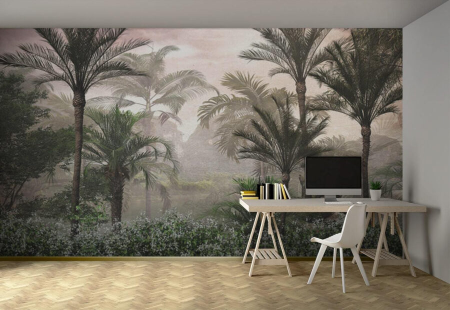 Fototapeta “Pokojné ráno v tropickom raji” – nie je ten názov priam lákavý? Predstavte si, že sa zobudíte na túto pokojnú scénu priamo vo svojej obývačke. Žiarivá zeleň, jemné kvety a tie vysoké palmy, to všetko zahalené do jemnej rannej hmly. Je to ako vstúpiť do vlastnej súkromnej džungle bez toho, aby ste museli opustiť gauč.