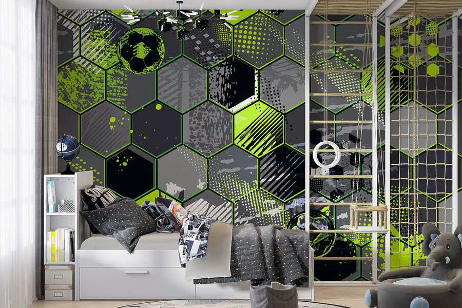 Vzor má tento funky šesťuholníkový charakter so škvrnami neónovej zelenej a elegantnej sivej. Je to ako zrážka futbalového ihriska s moderným umením. Ideálny pre každého, kto má rád vo svojom interiéri štipku zábavy a štýlu. Nie je to len tapeta – je to vyjadrenie. Predstavte si to: zobudíte sa, vezmete si kávu a zakaždým, keď okolo nej prejdete, zažijete malý záchvev šťastia. Skvelý začiatok konverzácie pre všetky prípady, keď k vám prídu priatelia a spýtajú sa: “Odkiaľ to máš?”