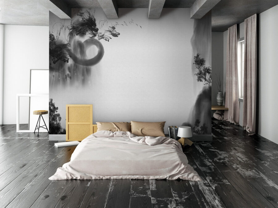 Pozrite si túto parádnu čiernobielu nástennú maľbu! Je to niečo ako zmes klasiky a umenia. Predstavte si, že vojdete do miestnosti a privíta vás táto tajomná, takmer snová scéna. Má takýto vzhľad, ktorý vo vás vyvolá predstavu dymového atramentu víriaceho na papieri, s náznakmi krajiny a abstraktných foriem, ktoré sa prelínajú.