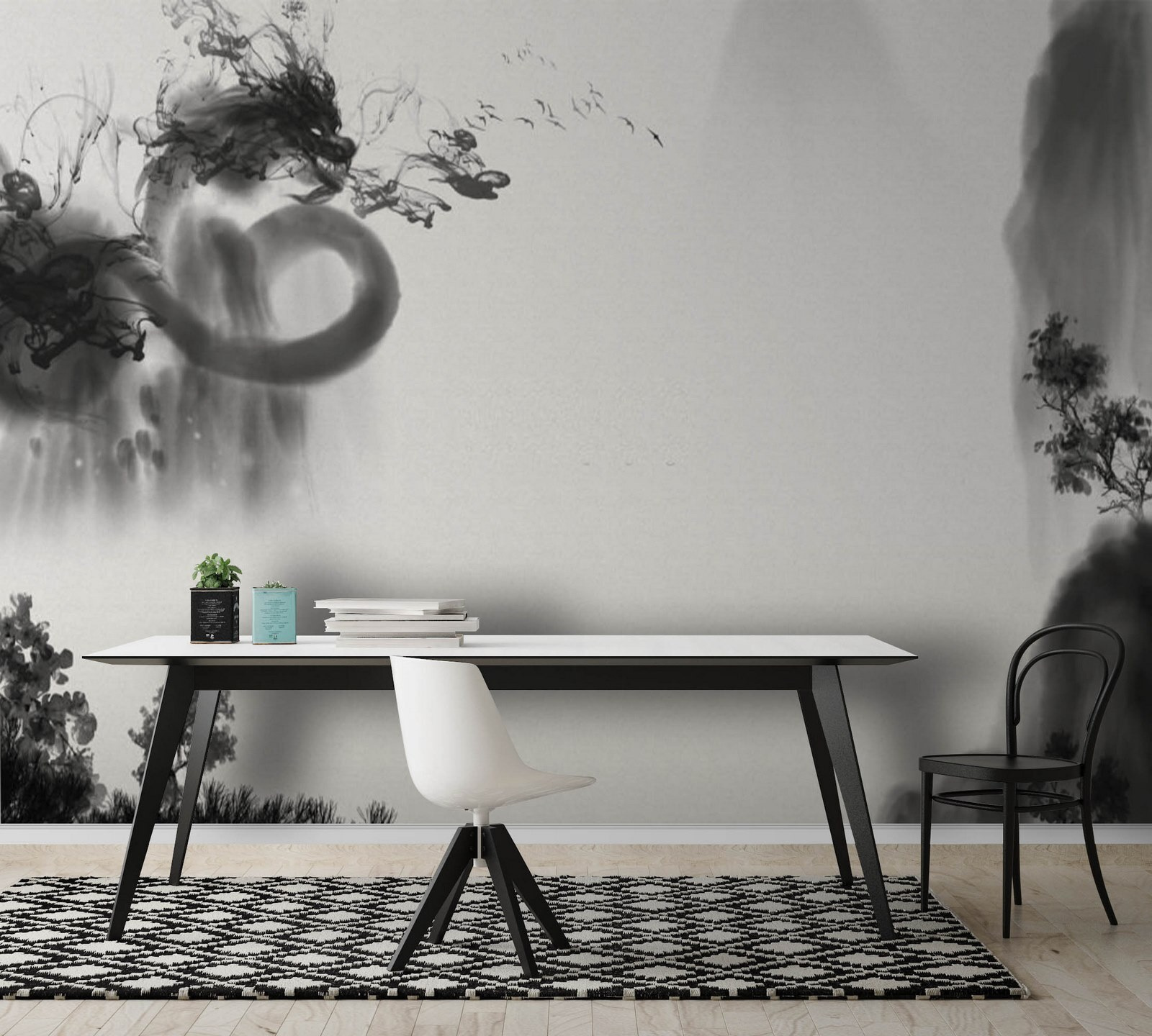 Pozrite si túto parádnu čiernobielu nástennú maľbu! Je to niečo ako zmes klasiky a umenia. Predstavte si, že vojdete do miestnosti a privíta vás táto tajomná, takmer snová scéna. Má takýto vzhľad, ktorý vo vás vyvolá predstavu dymového atramentu víriaceho na papieri, s náznakmi krajiny a abstraktných foriem, ktoré sa prelínajú.