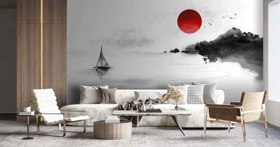 Predstavte si, že vojdete do miestnosti a privíta vás taká pokojná scéna – táto zasnená fototapeta zobrazuje červený kruh na pokojnom bielom pozadí. Je to ako váš vlastný malý kúsok zenového umenia. Odvážne červené slnko nápadne vyniká a ponúka spŕšku oživujúcich farieb, ktoré je ťažké ignorovať. V kombinácii s jemnou, hmlistou krajinou je to dokonalá rovnováha medzi pokojom a živosťou.
