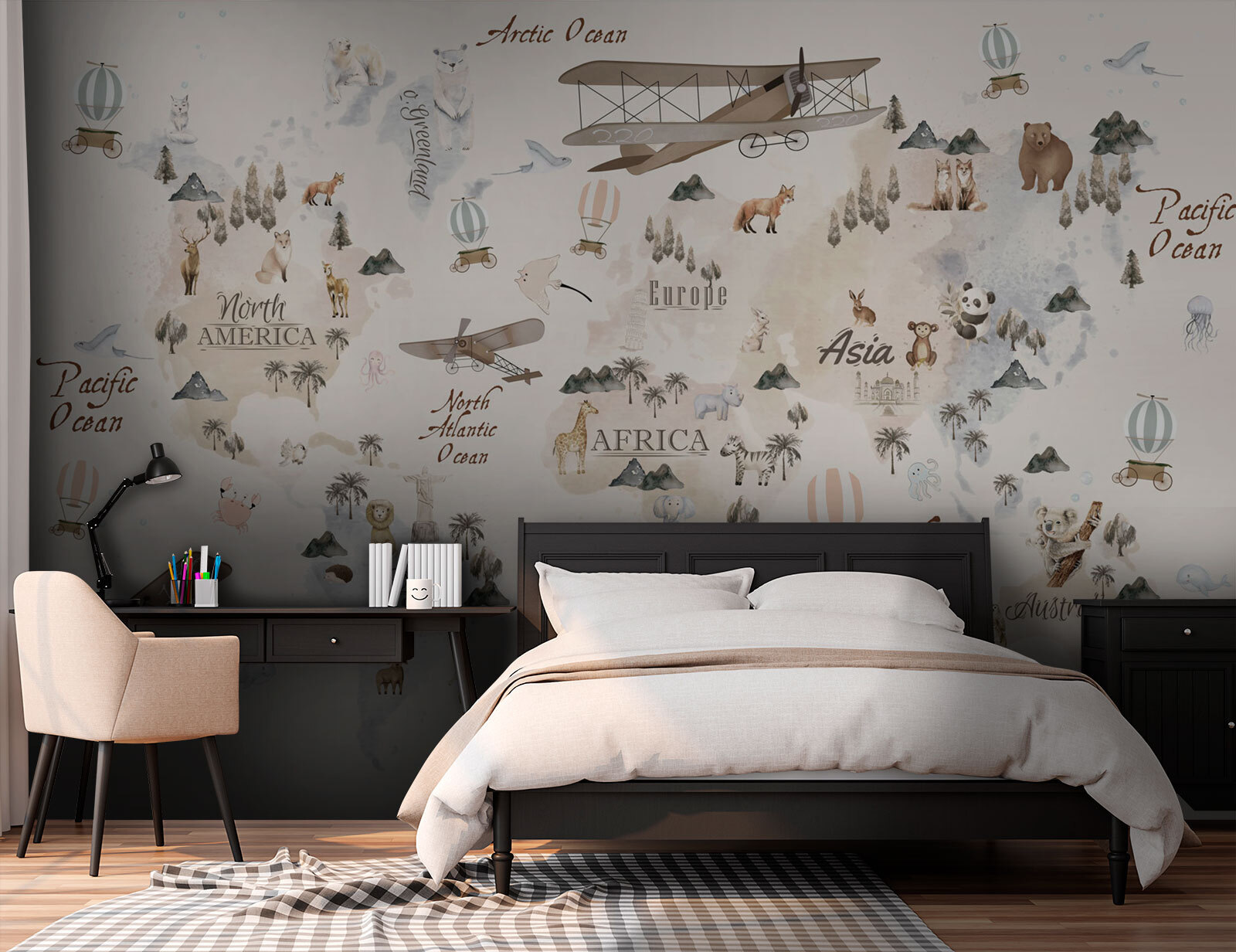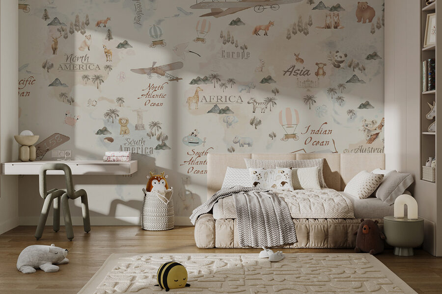 Predstavte si, že premeníte detskú izbu na snové dobrodružstvo! Táto nástenná maľba “Vintage mapa so zvieratami a lietadlami” je čarovná a rozhodne nie je určená len pre deti. Má to nádherné kúzlo starého sveta zmiešané s rozmarnými prvkami – teplovzdušnými balónmi, očarujúcimi zvieratkami a historickými lietadlami. Aj vy sa v nej stratíte!