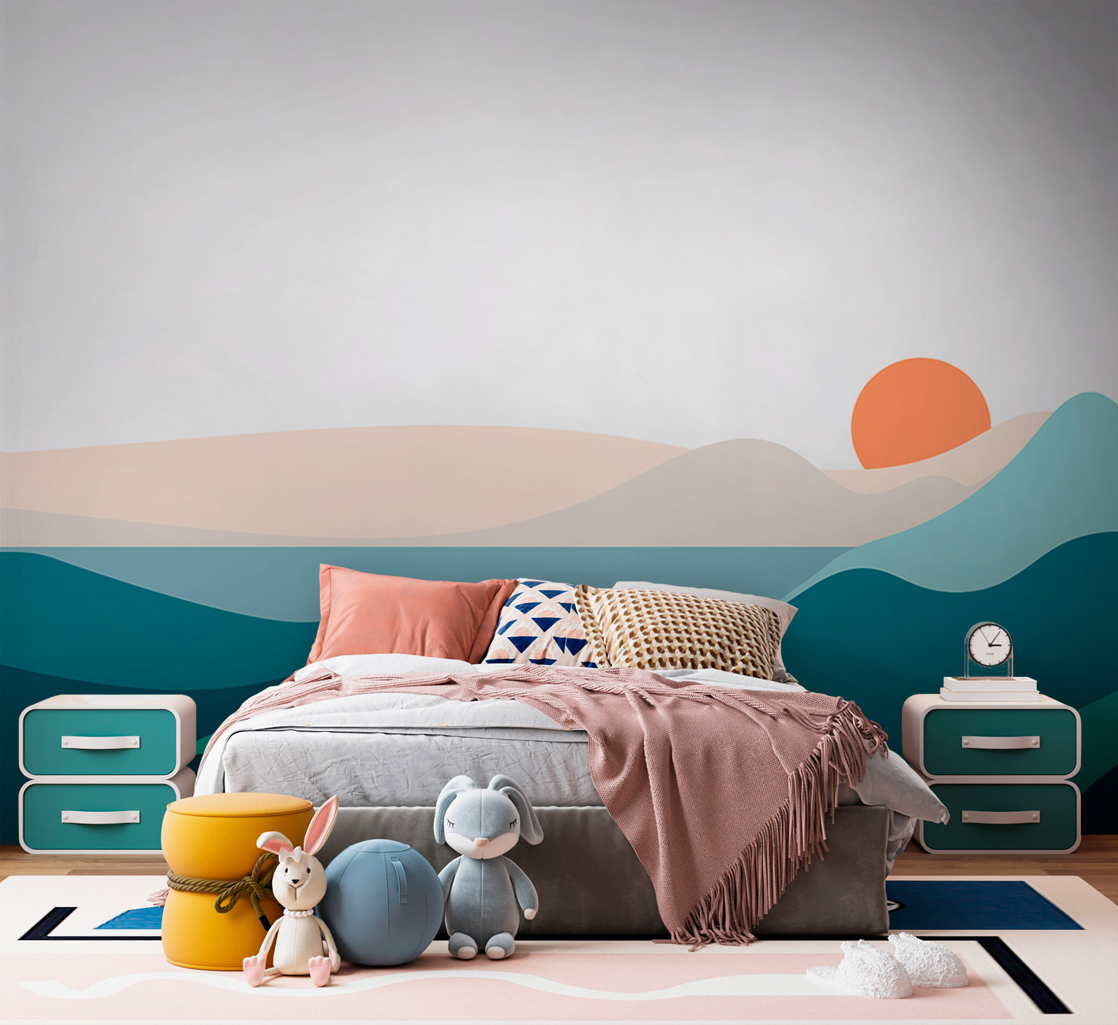Premeňte svoj priestor s touto úžasnou nástennou maľbou „Krajina s horami a západem slnka“. Predstavte si, že vojdete do miestnosti a zrazu ju uvidíte – majestátne hory objímajúce pokojný západ slnka. Je to ako volanie prírody, bez toho, aby ste si museli obúvať turistické topánky. Jemné farby pôsobia upokojujúco a sú ideálne pre útulný kútik na čítanie alebo štýlovú obývačku. Predstavte si, ako sa zviniete s teplým nápojom a tapeta vás obklopí pokojnou atmosférou. Je to každodenná pripomienka krásy prírody – bez hmyzu a blata. Zakaždým, keď sa na ňu pozriete, do vášho dňa sa vkradne trochu pokoja.