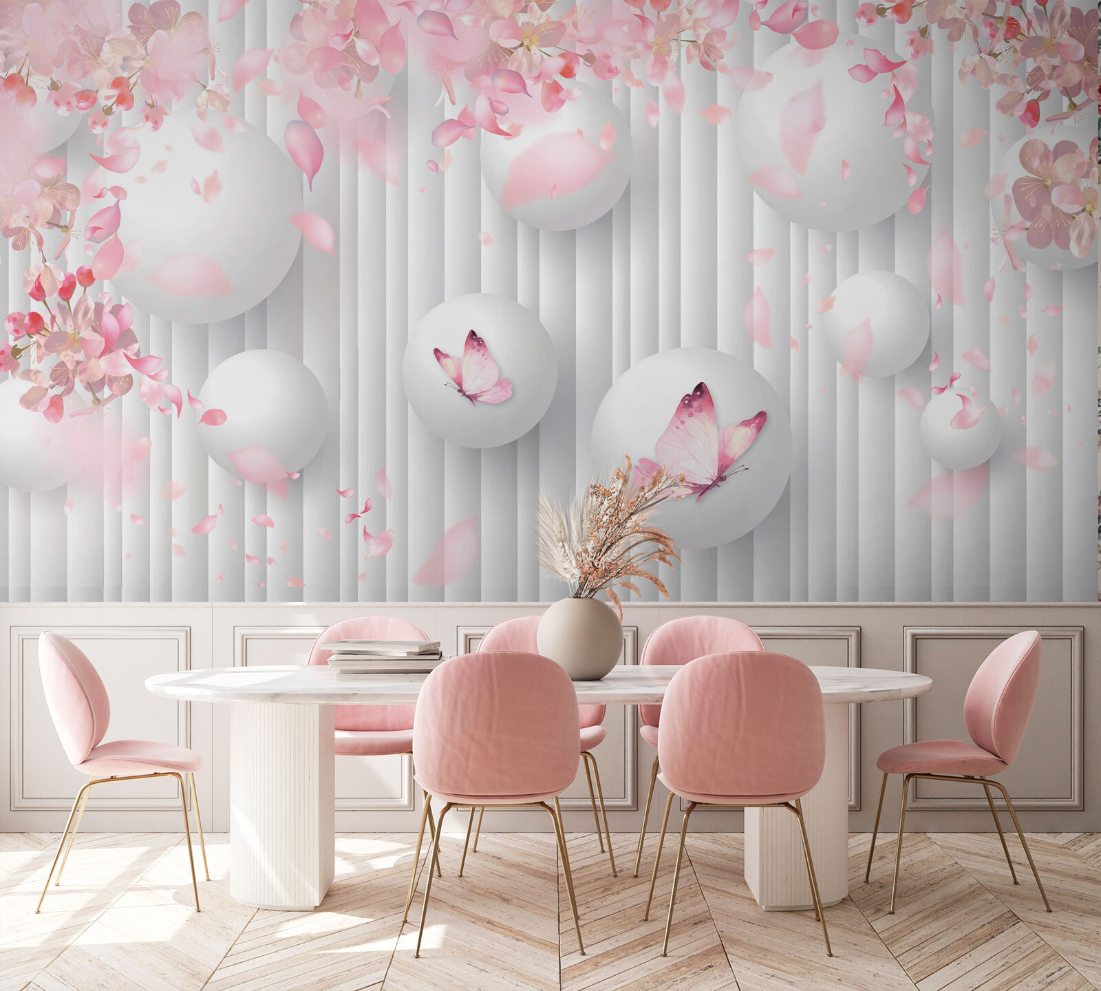 Premeňte túto obyčajnú stenu na umelecké dielo s touto nádhernou nástennou maľbou, na ktorej sa nachádza rozprávkový tanec bielych gúľ zdobených očarujúcimi ružovými motýľmi. Predstavte si, ako popíjate rannú kávu v priestore, ktorý pripomína pokojnú japonskú záhradu, a každý pohľad na stenu vám prináša trochu radosti. Mäkké okvetné lístky, ktoré sa vznášajú okolo, vyvolávajú príjemný pocit jari a prinášajú teplú, veselú atmosféru. Je to ako mať prírodu vo vnútri, bez alergie na peľ! Ideálne pre každú miestnosť, ktorá potrebuje trochu pokoja a kreativity – pripravte sa na komplimenty! Táto nástenná maľba nie je len dekoráciou, ale aj zdrojom dobrej nálady.