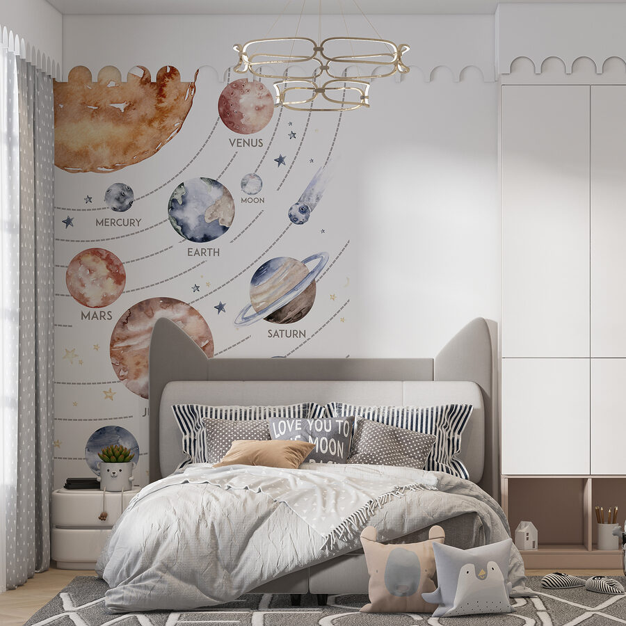 Predstavte si zaspávanie pri jemnej žiari Saturnových prstencov alebo živé hry s Merkúrom a Jupiterom na stráži. Má to upokojujúcu umeleckú atmosféru, ktorá je jednoducho správna – žiadne strnulé, nudné vzdelávacie plagáty. Len krásny, jedinečný kúsok, ktorý prinesie kúsok galaxie priamo do vášho domova. Táto nástenná maľba je hviezdnym výberom, či už chcete vyzdobiť detskú izbu alebo dodať pôvab herni. 🌟