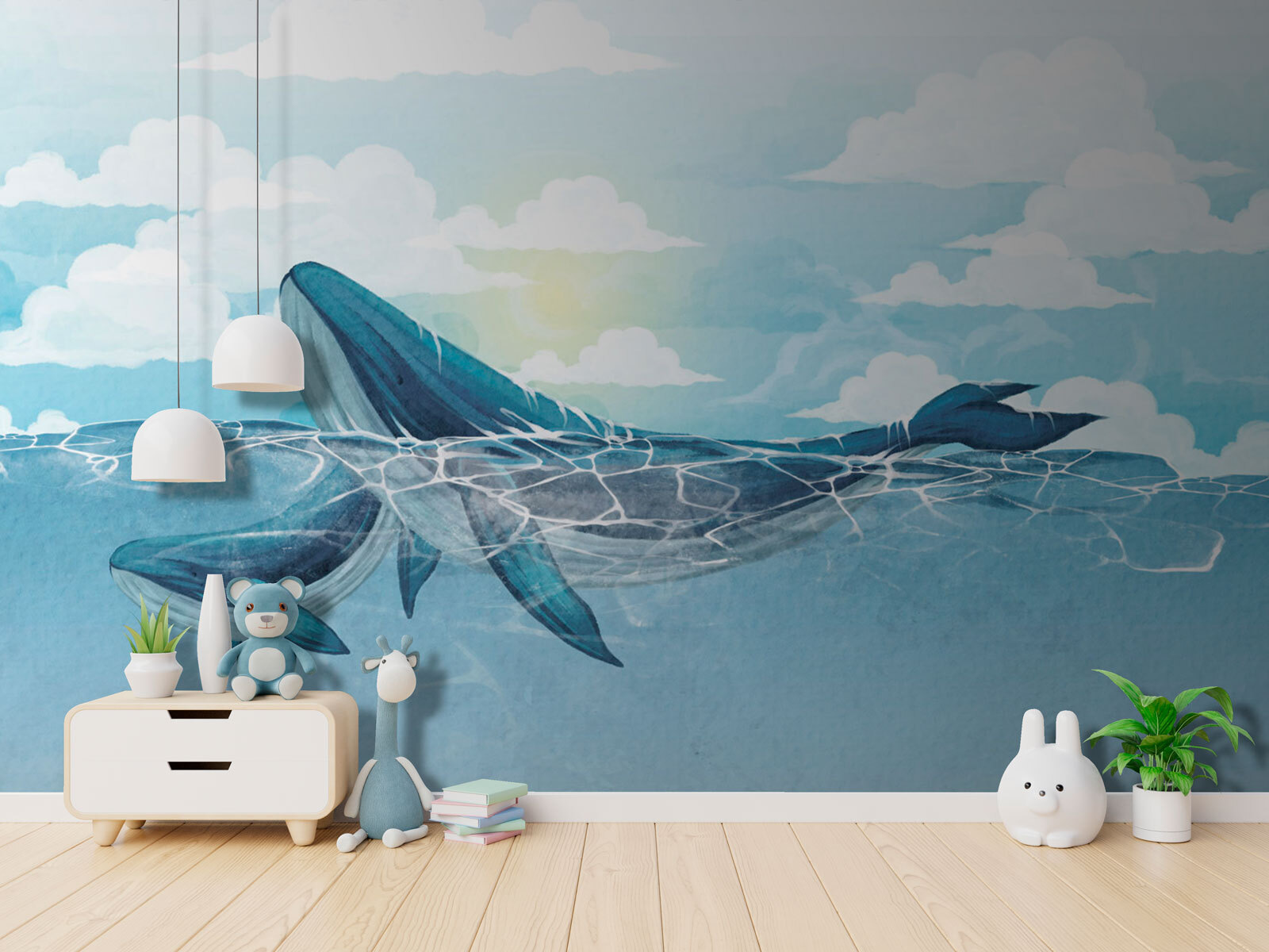 Dive into a serene underwater world with this stunning wall mural depicting a whale gracefully swimming in clear blue waters. It’s like having a piece of the ocean right in your living room! Imagine cozying up with a book while being serenaded by the sight of a gentle giant surfacing for air—how calming is that?