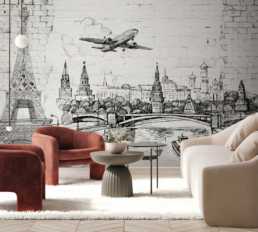 Premeňte obyčajnú stenu na zdroj konverzácie s touto nápadnou nástennou maľbou, ktorá zobrazuje mestský panoramatický pohľad v štýle skice a ikonický most. Je to ako keby ste si vždy, keď vstúpite do miestnosti, dopriali malú dovolenku – kto by nechcel výhľad na Eiffelovu vežu a Kremľ? Predstavte si, ako popíjate rannú kávu, snívate o cestovaní alebo plánujete svoje ďalšie dobrodružstvo. Čierno-biely dizajn dodáva štýlovú atmosféru, vďaka čomu sa ľahko kombinuje s akýmkoľvek interiérom. Navyše určite vzbudí zvedavosť – vaši priatelia si možno budú myslieť, že ste sa práve vrátili z bleskovej cesty! Štipka kultúry na vašej stene – ideálne pre tých, ktorých srdcia naplňuje túžba po cestovaní.