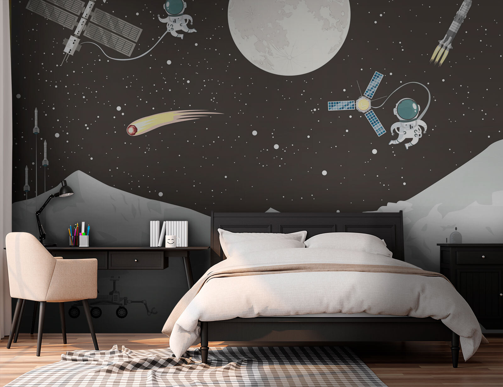 Snívali ste niekedy o tom, že sa necháte unášať medzi hviezdami? Táto nástenná maľba “Mesiac v splne na oblohe” by vám mohla tento vesmírny sen oživiť. Je ideálna pre snílkov, nočné sovy a vesmírnych nadšencov a premení každú miestnosť na galaktický útek. Predstavte si, že prídete domov po dlhom dni, rozvalíte sa na gauči a máte pocit, že sedíte v prvej rade vesmíru. Je to ako nočný útek, bez vesmírnej lode! Mesačné hory, astronauti vznášajúci sa okolo – to všetko je tu a navodzuje dobrodružnú a upokojujúcu atmosféru. Ideálny pre detskú izbu, priestor môže dokonca inšpirovať jedného alebo dvoch budúcich astronautov! Je to hravý a zároveň pokojný doplnok na každú stenu, ktorý podnecuje predstavivosť a pocit úžasu.